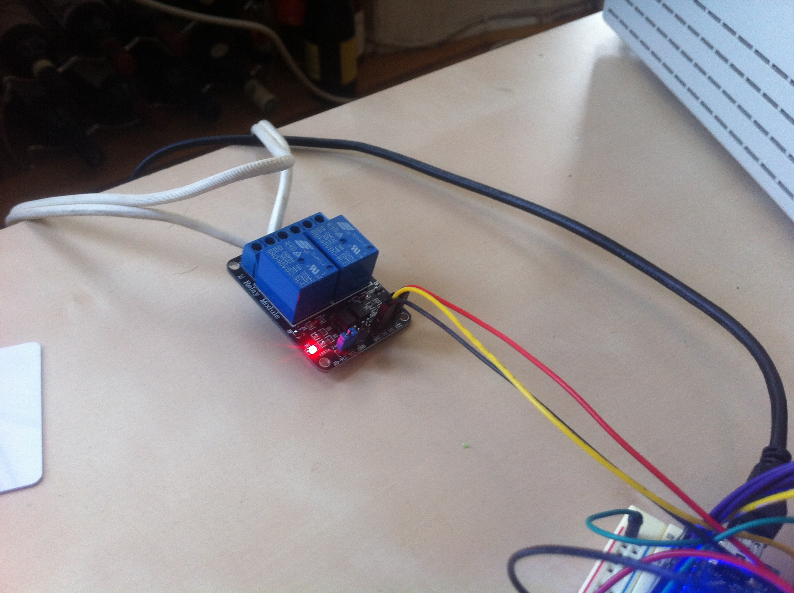 I’m using a PN532 NFC/RFID breakout board connected to an Arduino. Using this the Arduino can read the ID code on any ISO14443A RFID card. If that ID exists in a list of allowed users, then the Arduino activates a relay that allows power to flow to the Mac. If the ID is not in the allowed list, the relay stays deactivated. Since the PN532 operates at 3.3V, and the Arduino at 5V, a 4050 level shifter chip is used in the communication between them.