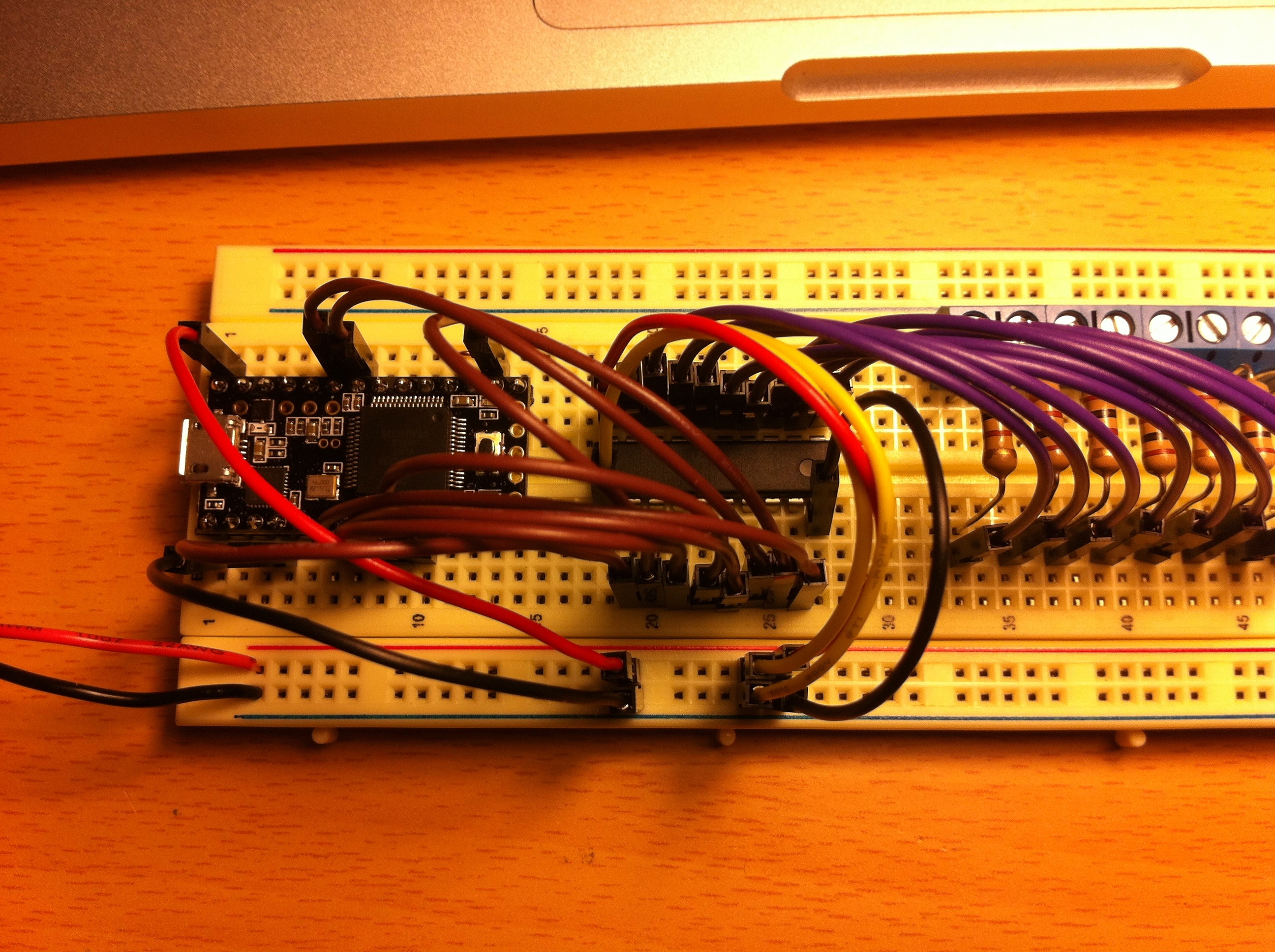 The final control box utilizes a Teensy 3.1 to run the program controlling the LED strips. It produces the signal to set each LED’s brightness and color and a 74HCT245N acts as a level shifter to get the Teensy’s 3.3v signal up to the 5V needed. There are 8 runs of LED chained strips with over 3000 total LEDs. I settled on using the Teensy after testing and verifying that it could handle the number of LEDs required at the speed required. It had the advantages of simplicity and robustness over the previous setup I had that used a BeagleBone. Both of those had the advantage of bandwidth over the Arduino Mega which could not drive this many strips of this length fast enough. The LEDs used are the WS2812 type and the strips are 60 LEDs per meter. My program on the Teensy leverages the OctoWS2811 LED library from PJRC.