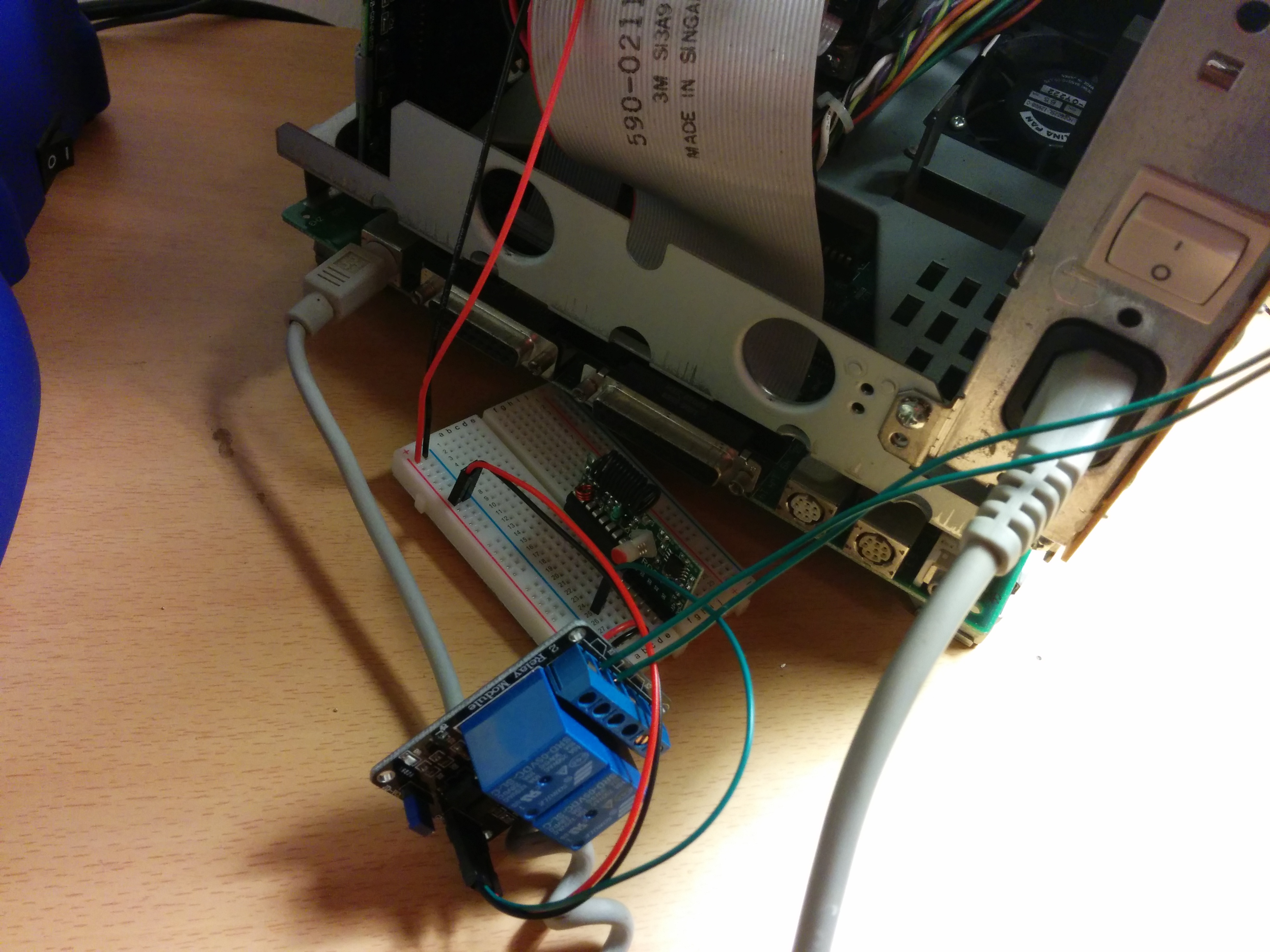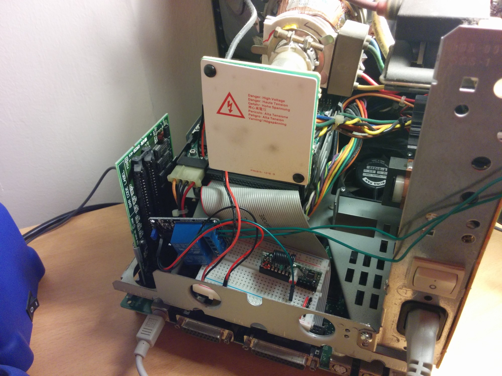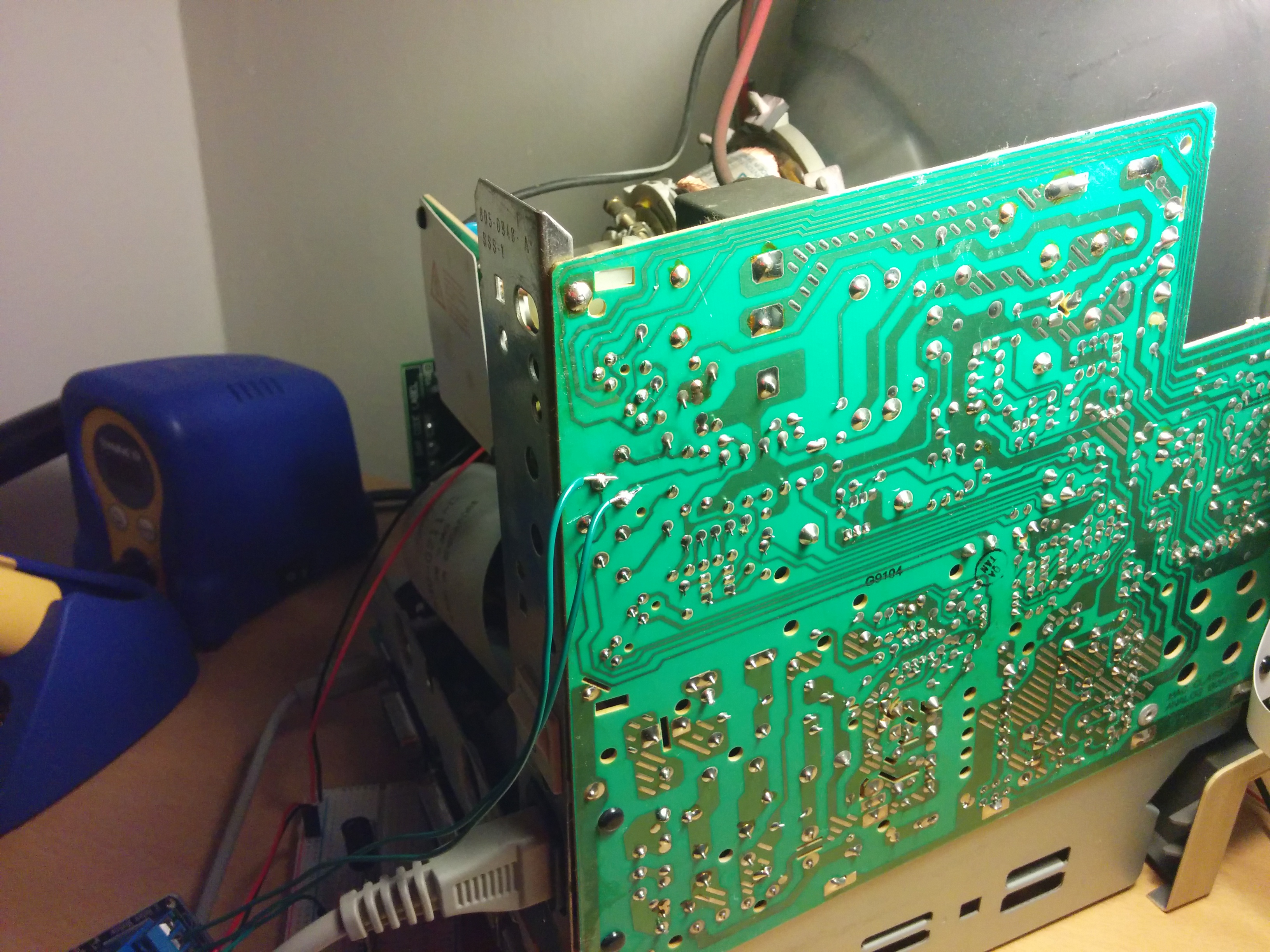 For this test, I used a keyfob remote and RF receiver from Adafruit, and a relay module from SainSmart. When the receiver gets the keypress command from the remote it toggles the voltage at a pin which in turn toggles the state of the relay. The relay shorts the wiper pin of the pot to the lower potential pin of the pot. This particular pot for the brightness adjustment has about 600V across it’s terminals, unlike the vertical adjustment pot for example which has 7V across it’s terminals. When the relay shorts these connections, it has a similar effect to the pot being manually turned all the way to that extreme, in this case turning the brightness all the way down and effectively turning the screen off. With this setup the keyfob remote can turn the screen on and off wirelessly.