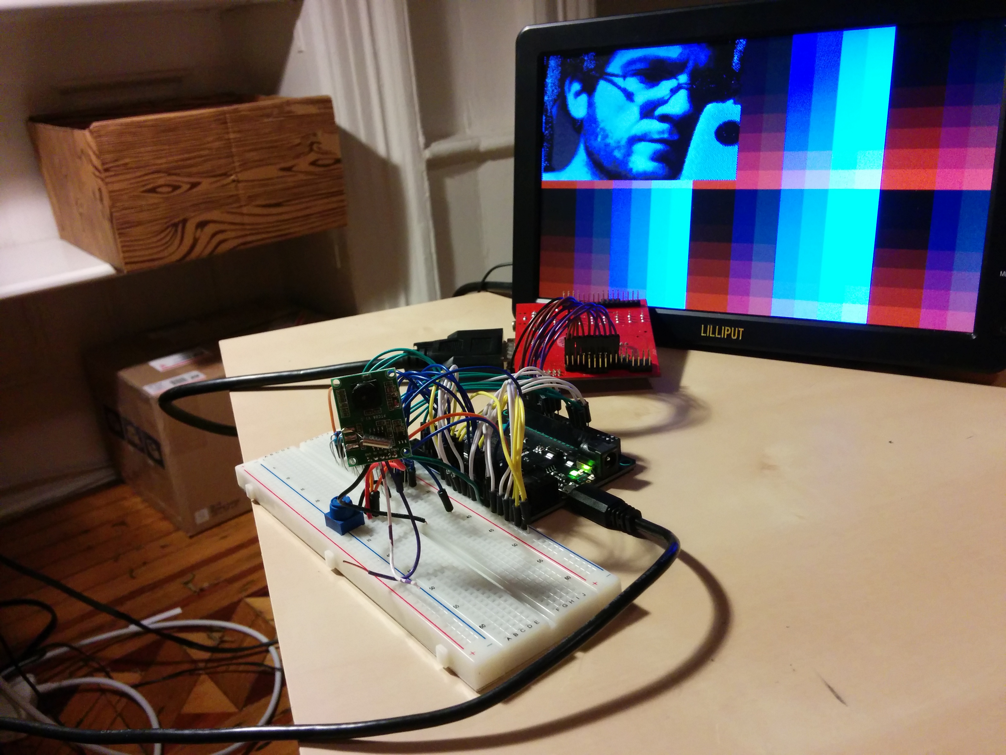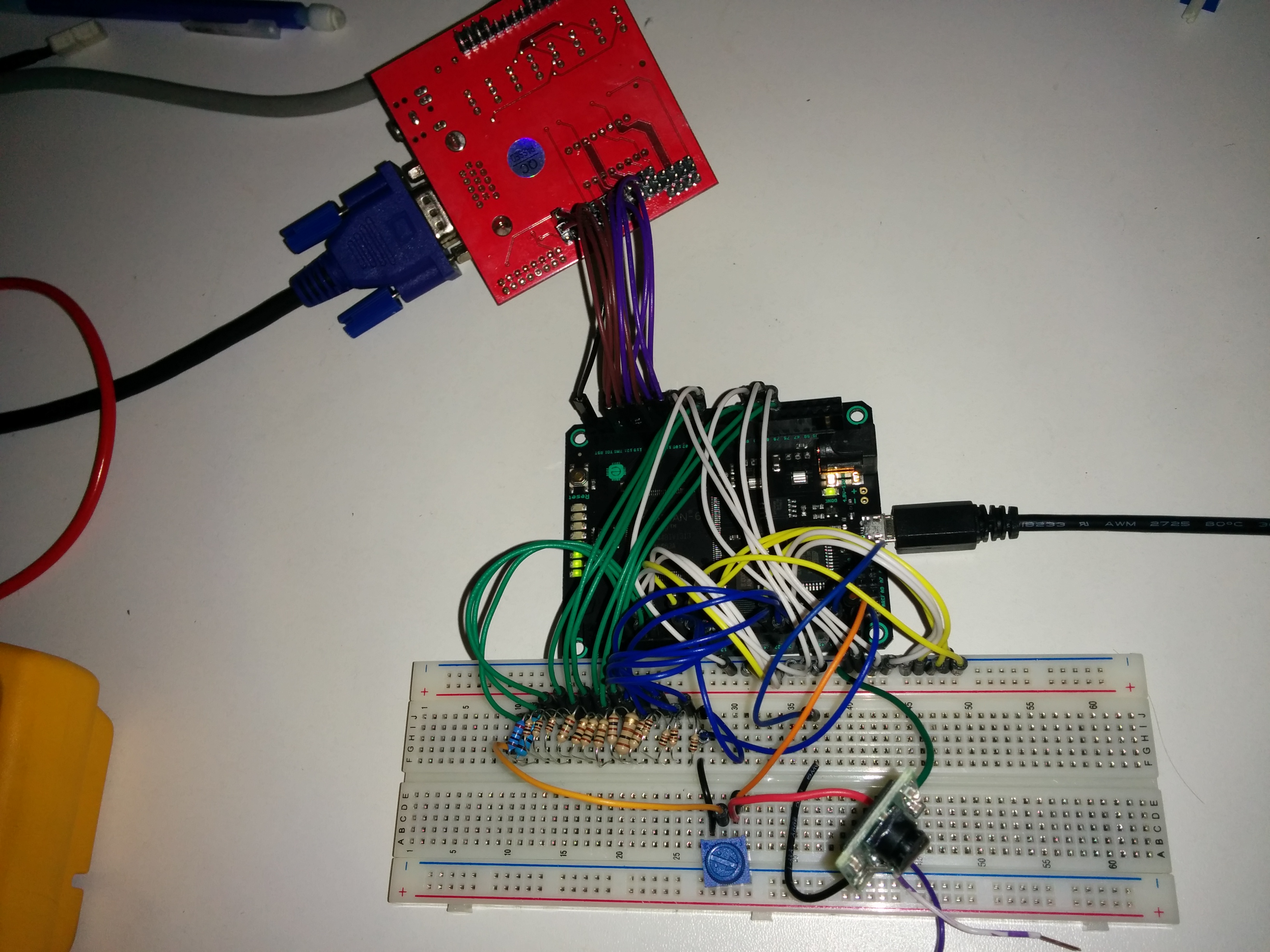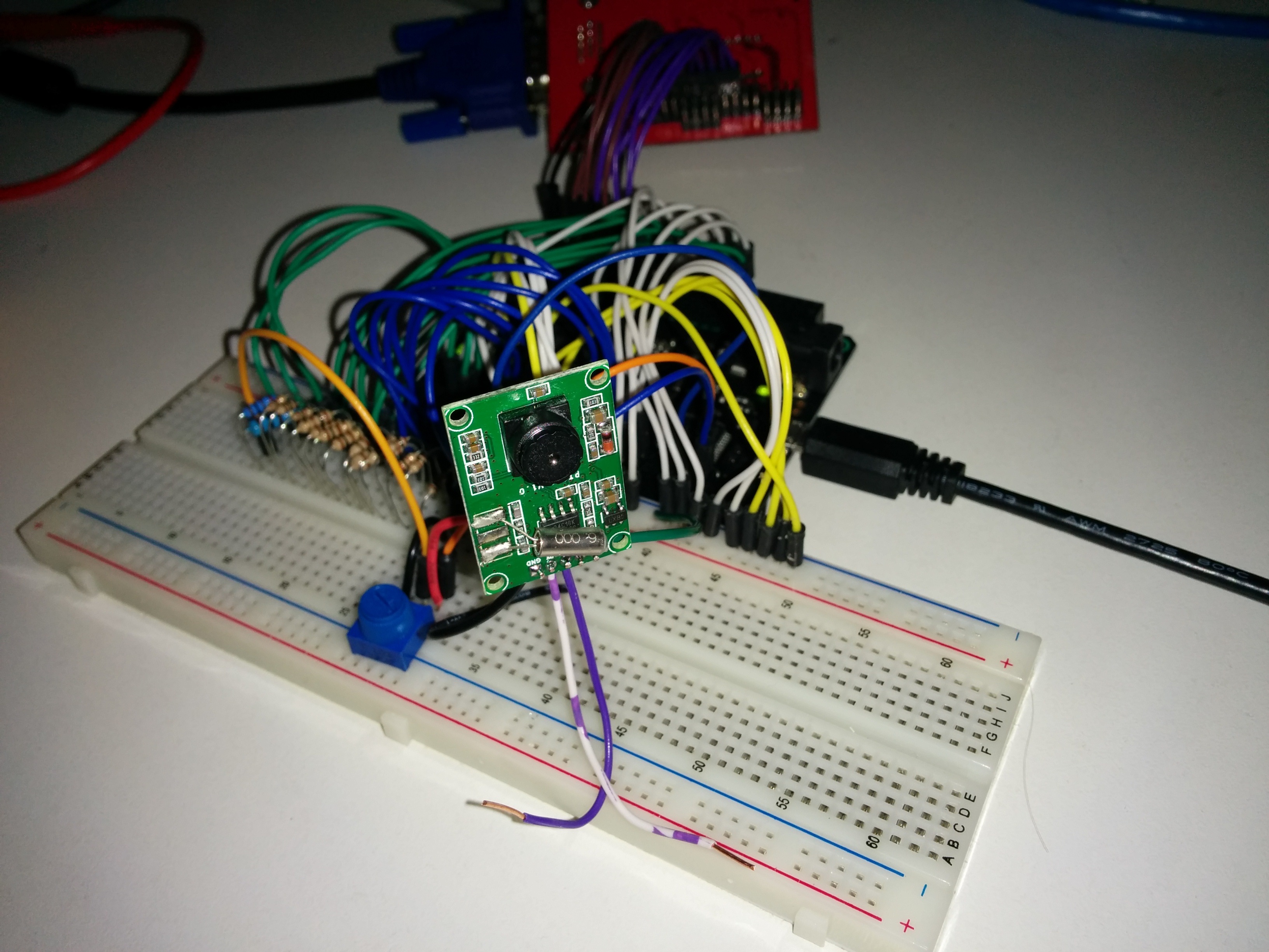 The green wire from the camera is the NTSC output. I’ve plugged that into the blue strip on my breadboard and run separate wires from that to each of the 16 differential pairs I’ve enabled on my FPGA. To each pair is also one wire going to one rung of the resistor ladder.
