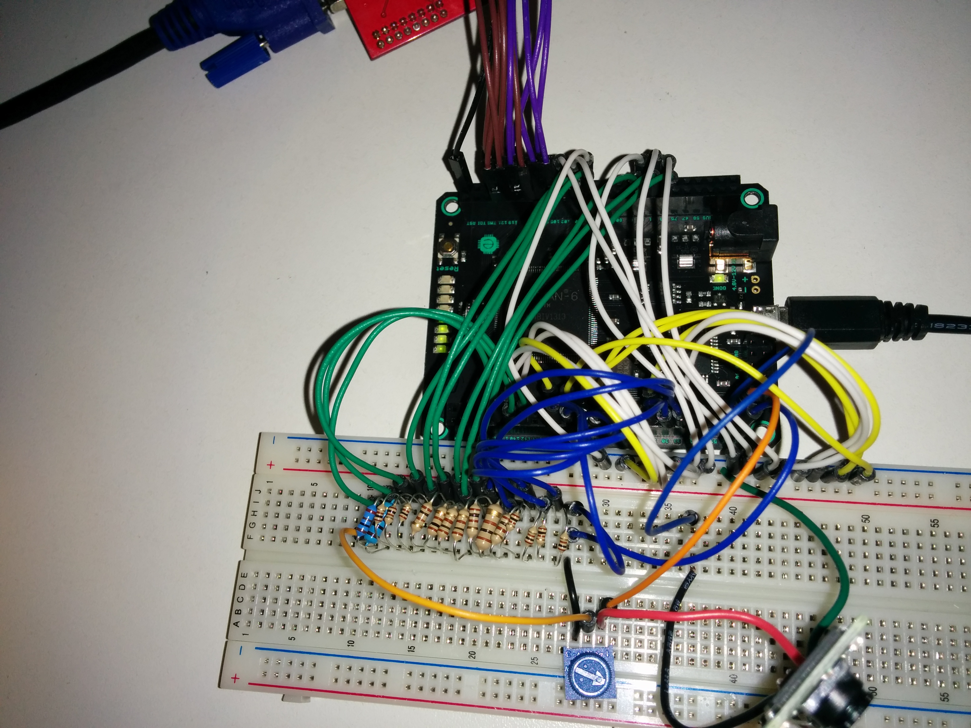 There’s some noise, it’s a little washed out, it’s only 4-bit resolution, luminance only no chroma info, But…. IT WORKS!!!! Here’s the principle on a high level. Many FPGA’s support reading differential signals, so they have the hardware to compare 2 voltages. If you create a resistor ladder, and setup differential input pairs, one for each rung of the ladder(paired with the input), then you can make a flash ADC, EVEN if you only have a breadboard and a handful of resistors(‘closely’ matched). There’s limitations like the voltage range you can read and how many pins you need, but still.