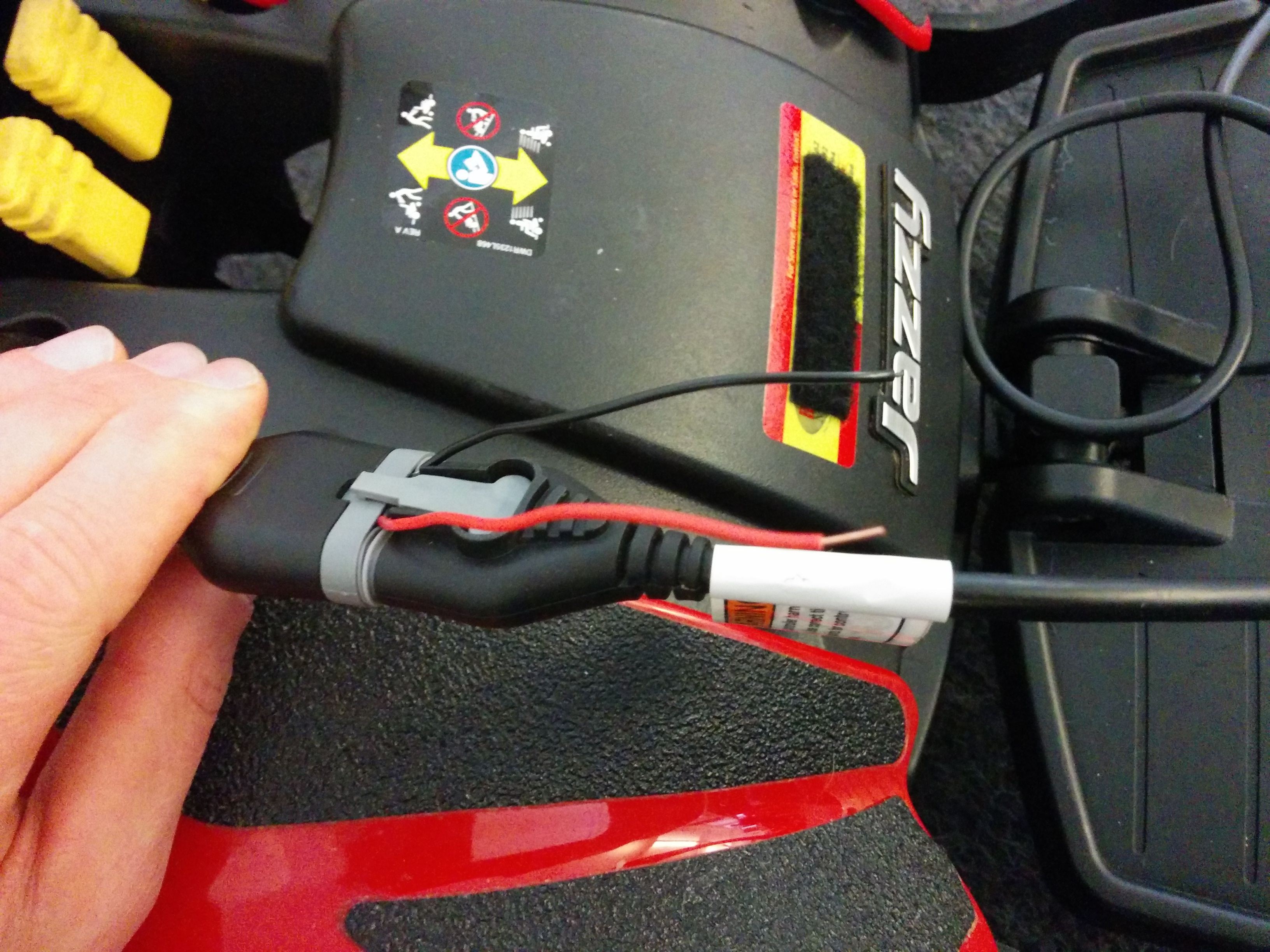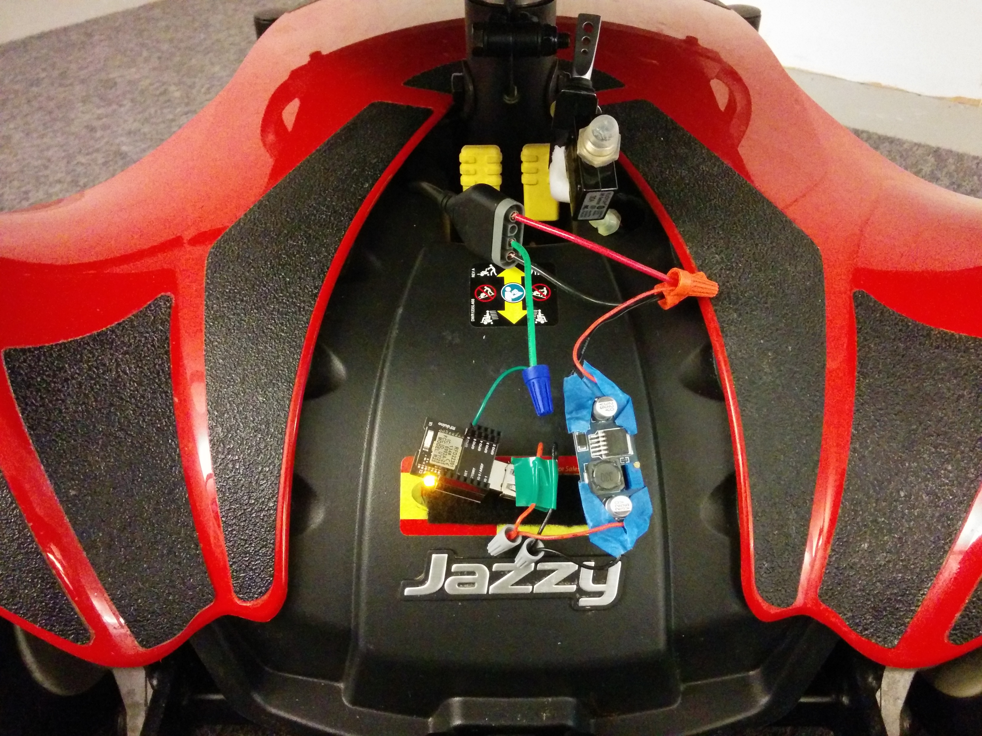 After I had things working with an Arduino Nano and an XBee controlling controlling the wheelchair remotely, I switched to my Android phone and an RFduino communicating over BLE. Upon getting control commands from my phone, the program on the RFduino sends the corresponding command codes to the wheelchair motor driver. I wired up a buck step-down converter to get the batteries’ 24V down to 5V, which the USB adapter then brings further down to 3.3V. I also wired up an extra kill switch, just in case.