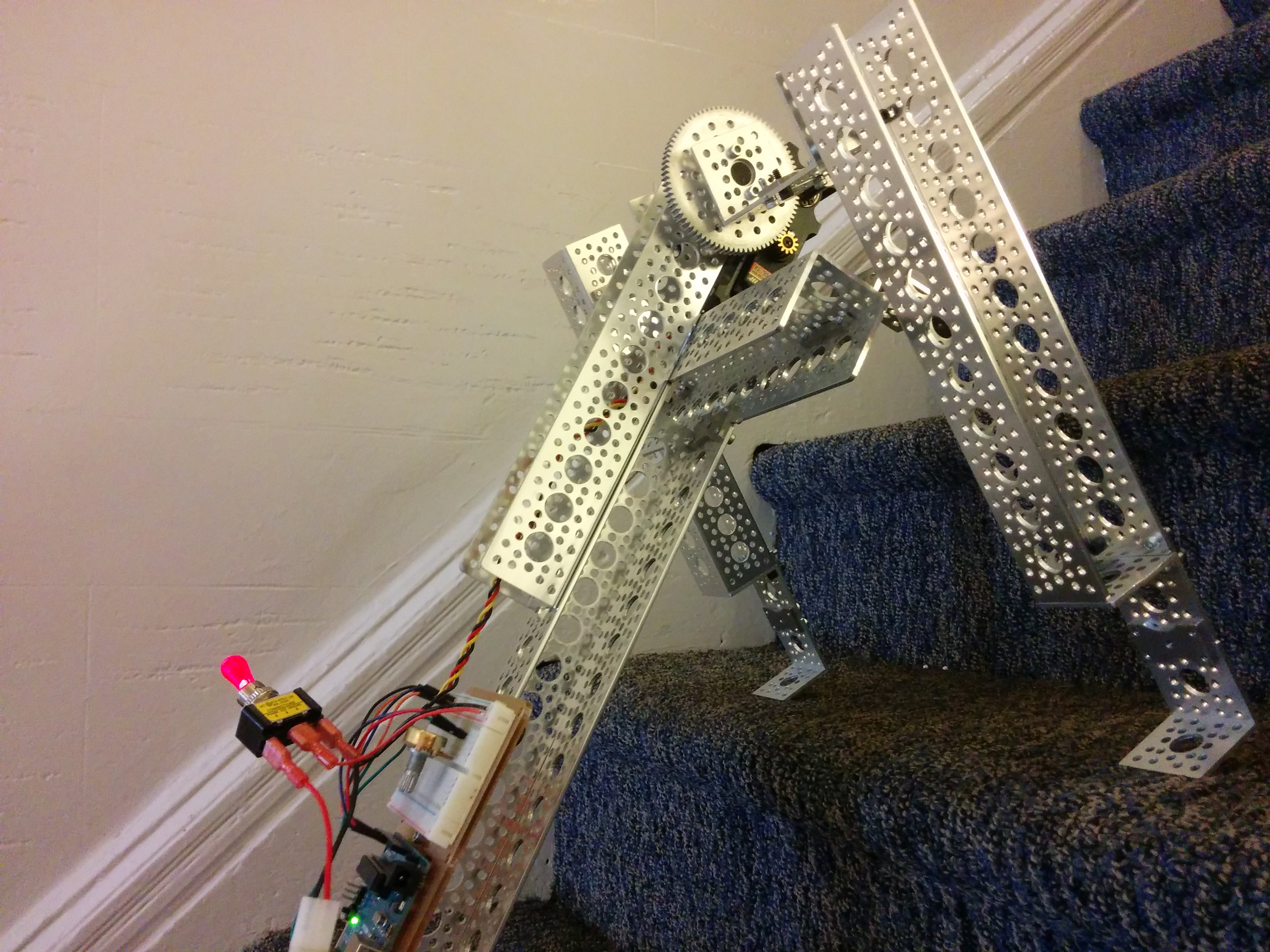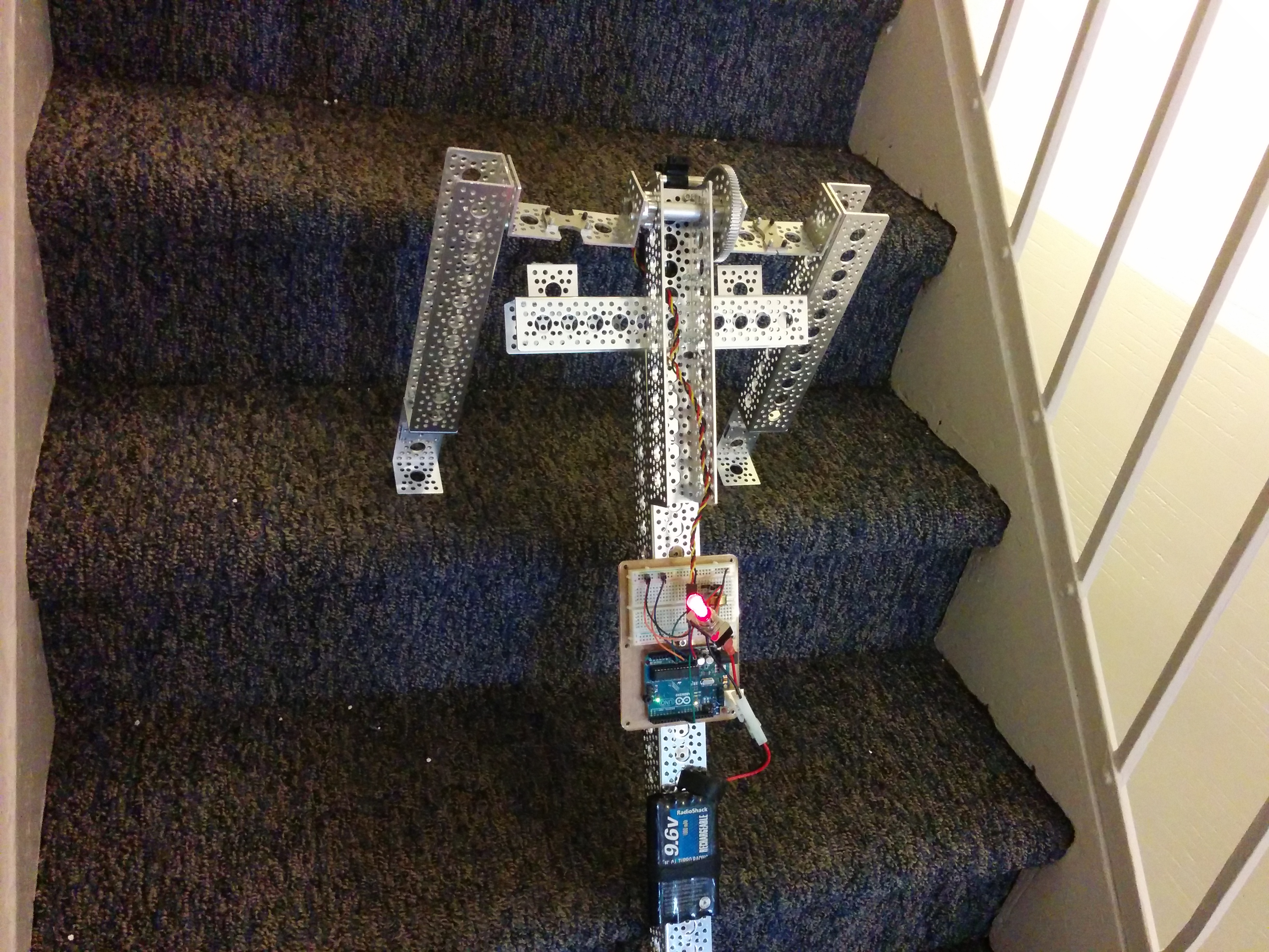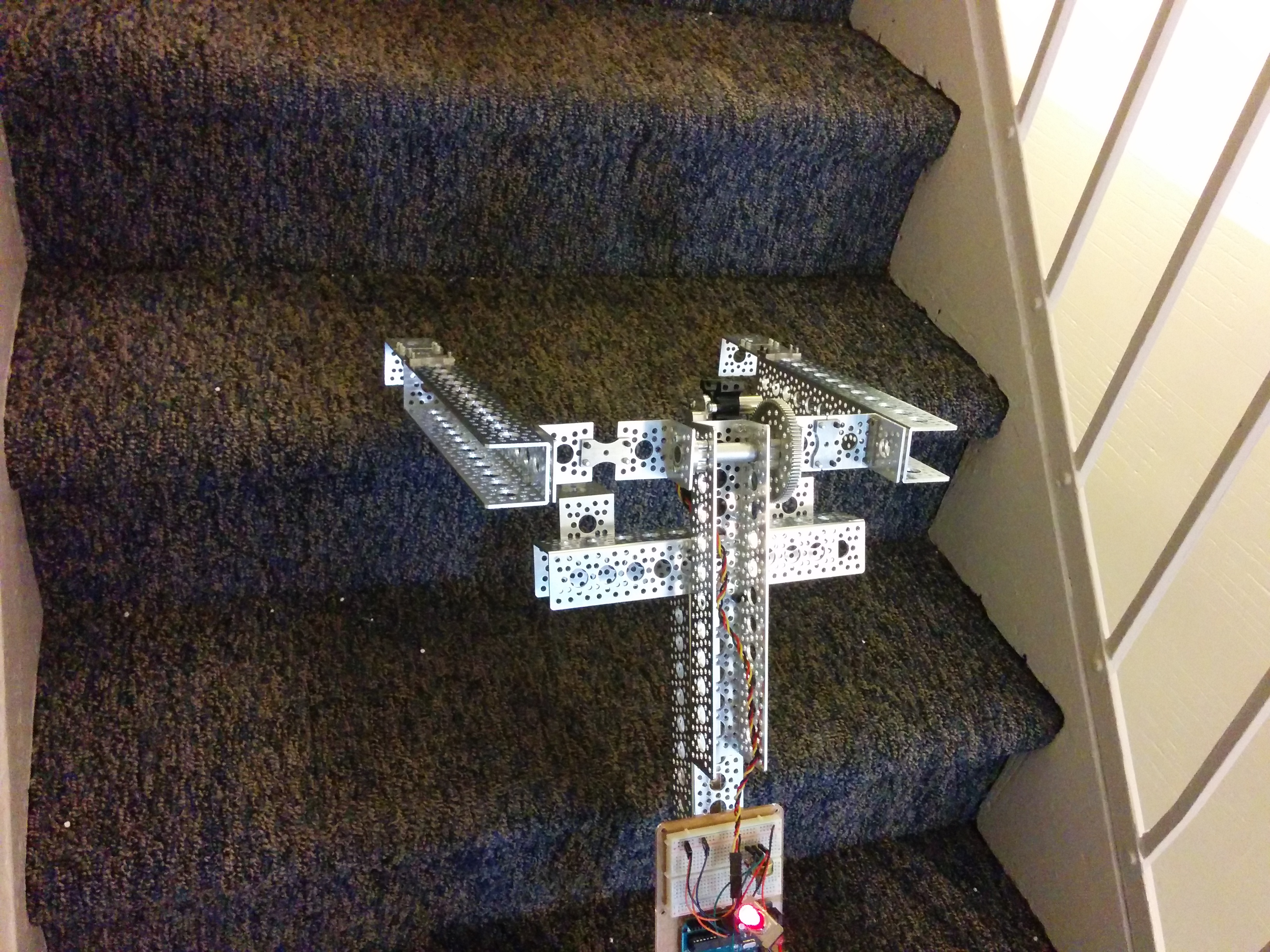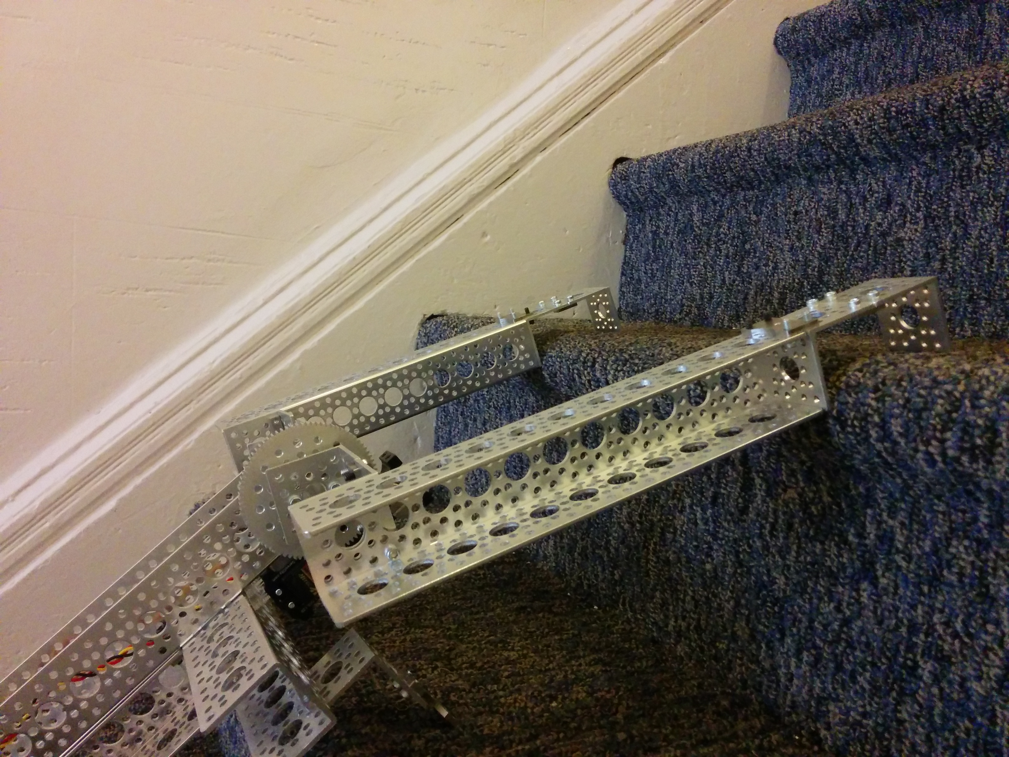 The only real constraint other than the robot climbing stairs, was that it use some Actobotics parts and some SparkFun parts. I gave myself the additional contraints of using only the parts I already had on hand from another project I was working on, and since I was short on time, to wrap it up in a day or two.