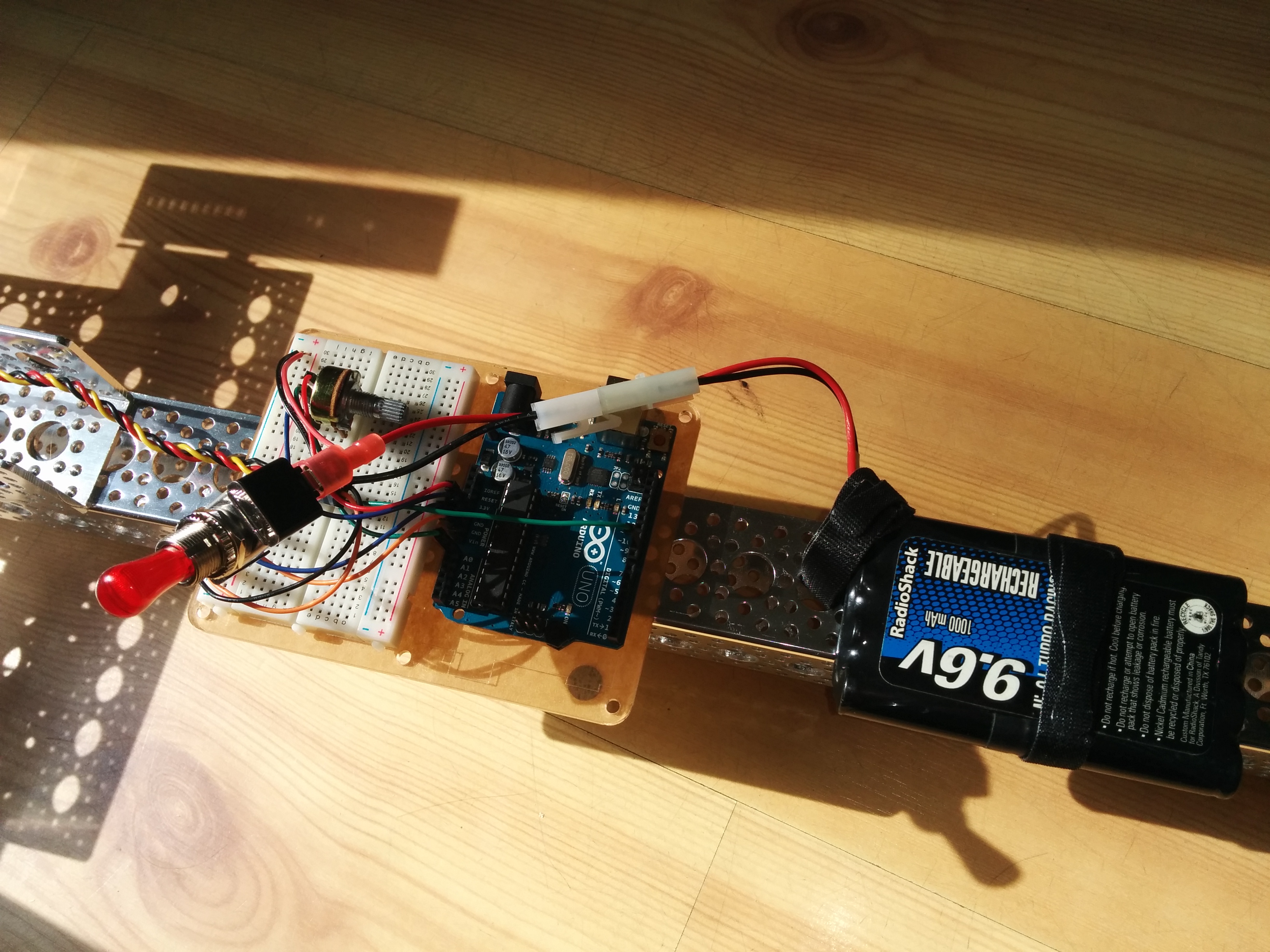 The electronics are pretty straightforward. Everything is powered off of a 9.6V rechargeable battery pack. The one motor, a servo, gets its control signal from the Arduino. The Arduino sends that signal based on the position of a pot. Since the servo is running in open loop mode, the position sent is effectively a speed control rather than a target position to reach. In this way the servo runs in continuous rotation and has a speed adjustment. I found that running this robot at different speeds definitely varies its odds of success and its entertainment output level.