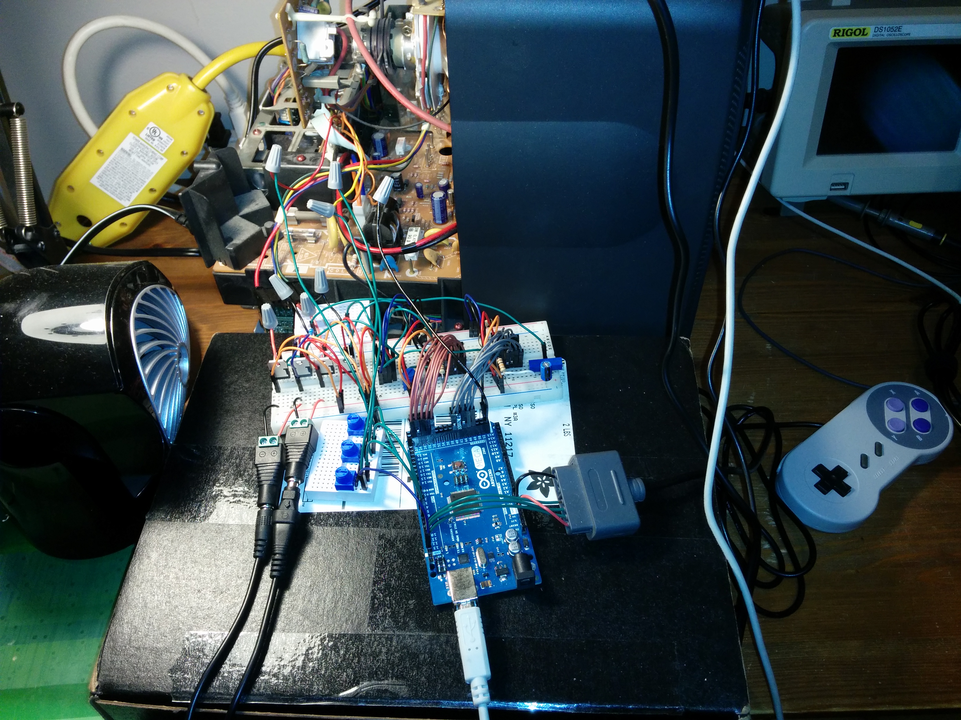For a microcontroller for this project I had an Arduino Mega on hand so I decided to use that since it had a large number of GPIO pins broken out which was the main thing I needed. The 2 MDACs I chose were parallel input 10-bit, so the 2 of them were already 20 pins. Add to that 3 pins for the CRT beam colors and 3 pins for the SNES controller interface.