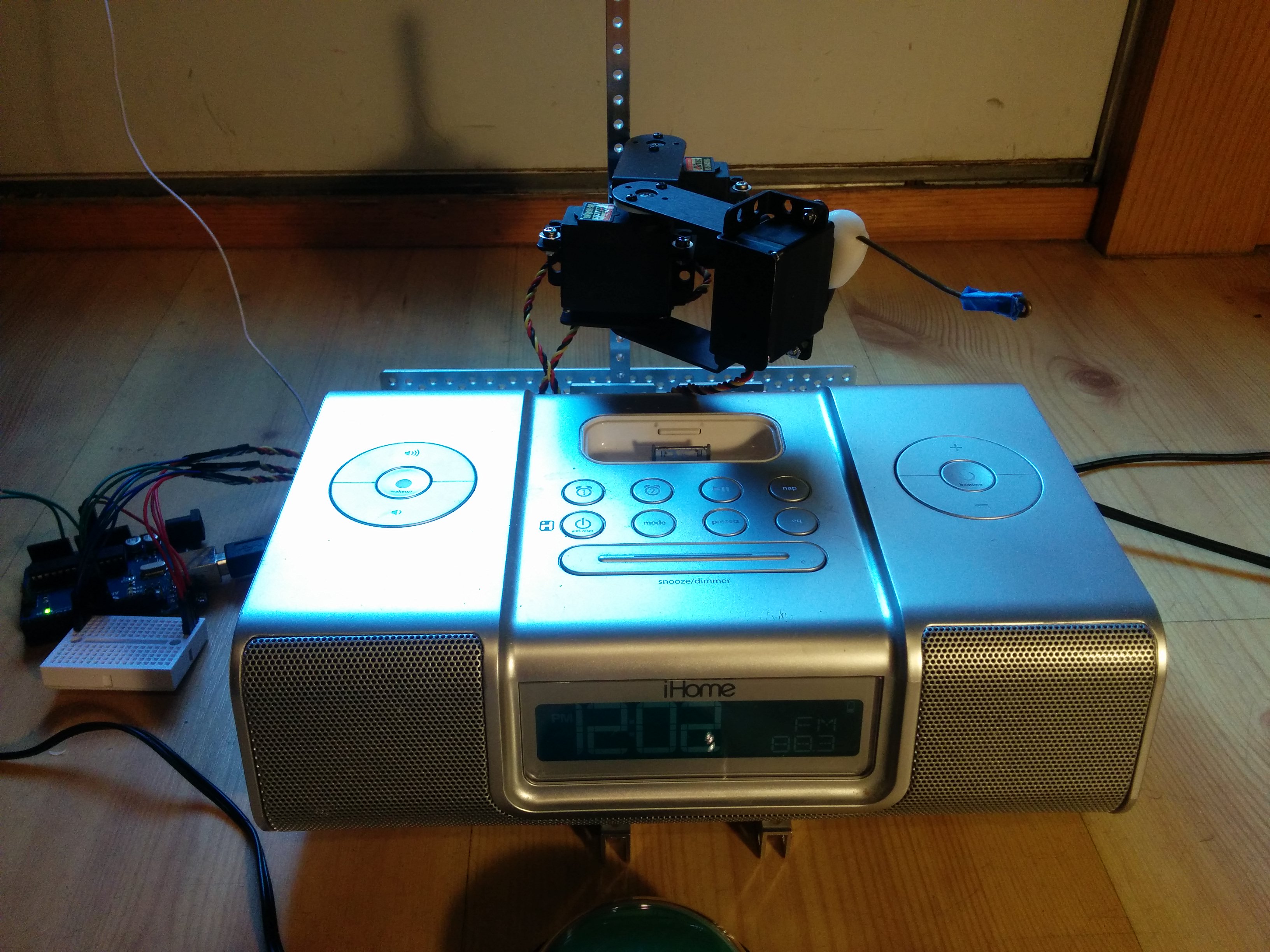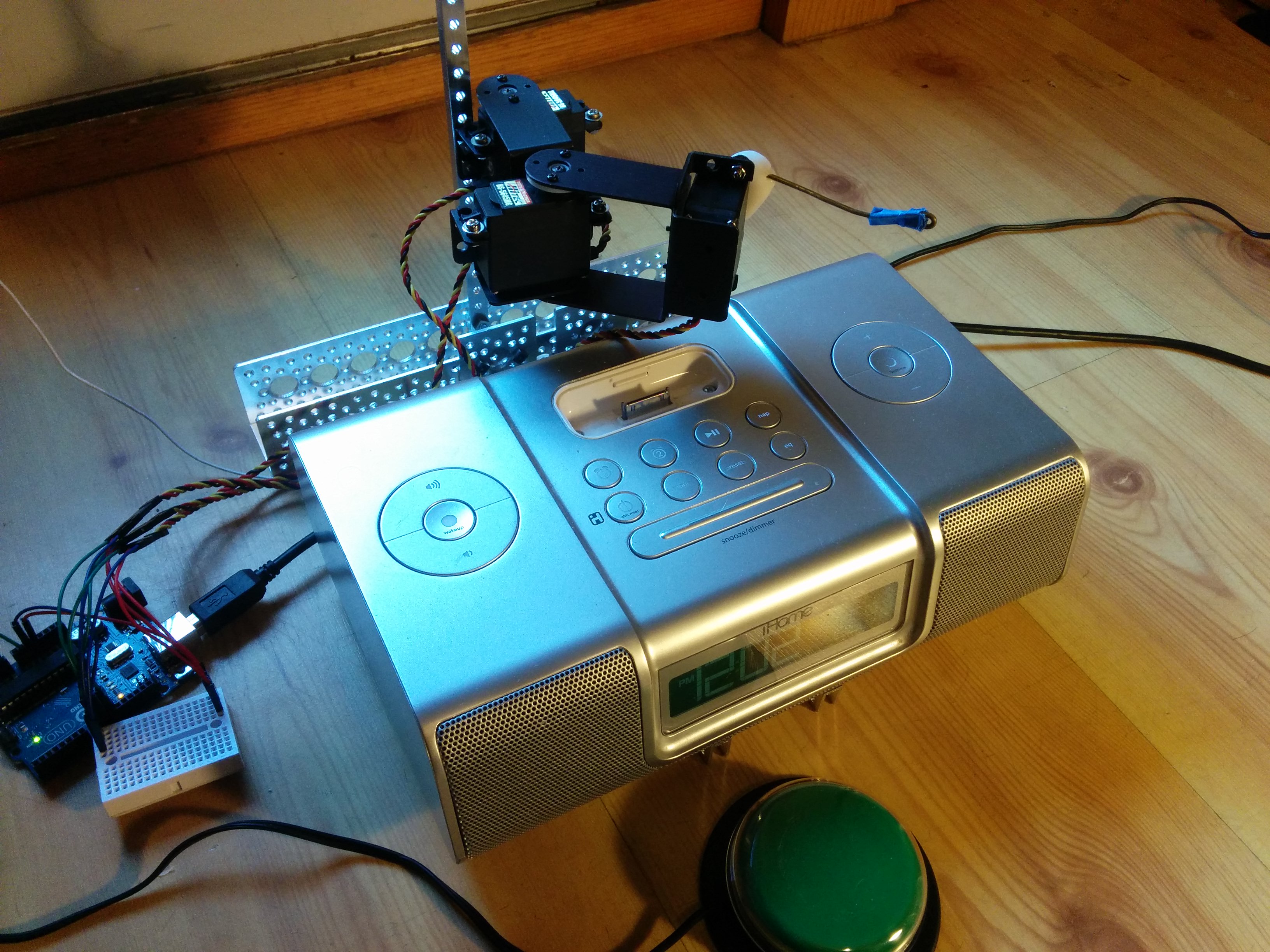 3. Very cool. I was just wondering how you made the actual button pushing part, it looks like you stuck putty or glue on the servo horn with a bit of wire hanger sticking out. I’m just curious because I’m doing a project which requires a servo to push a button and that technique could come in handy.