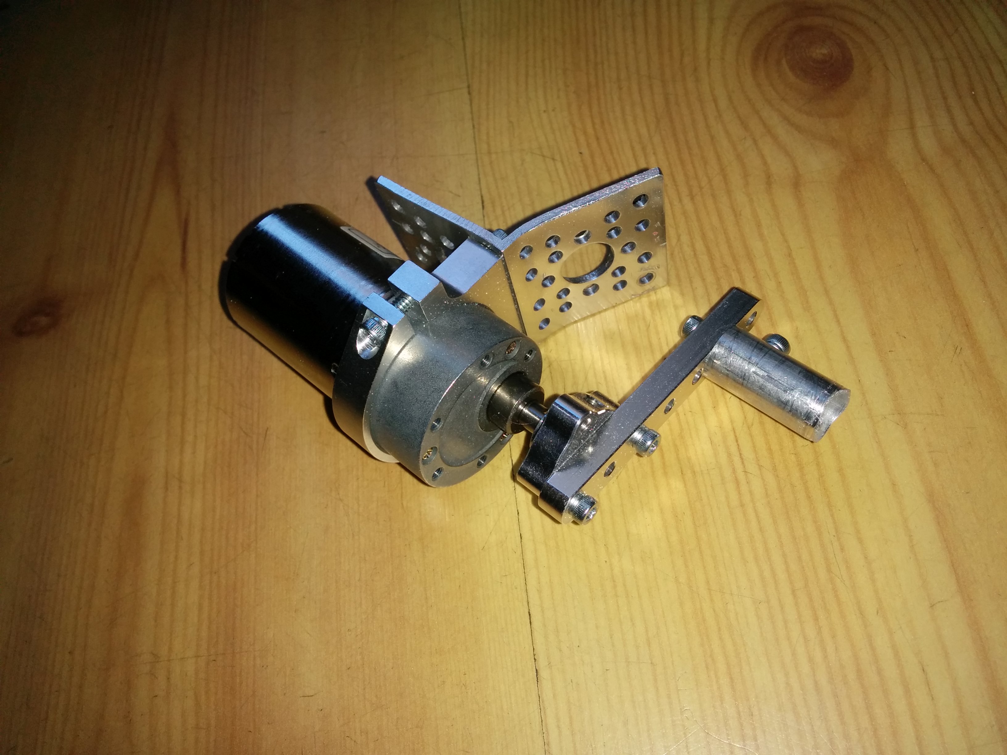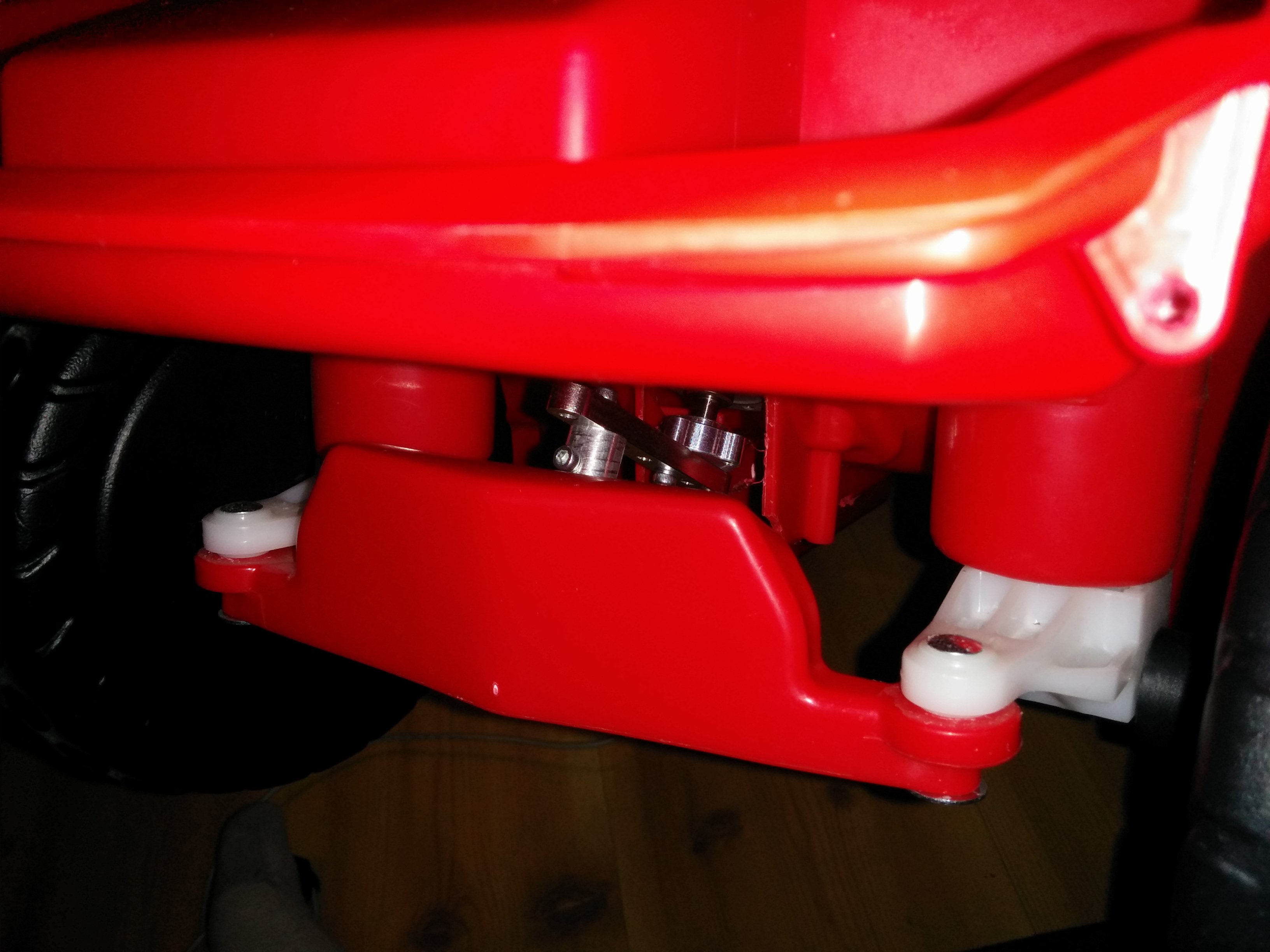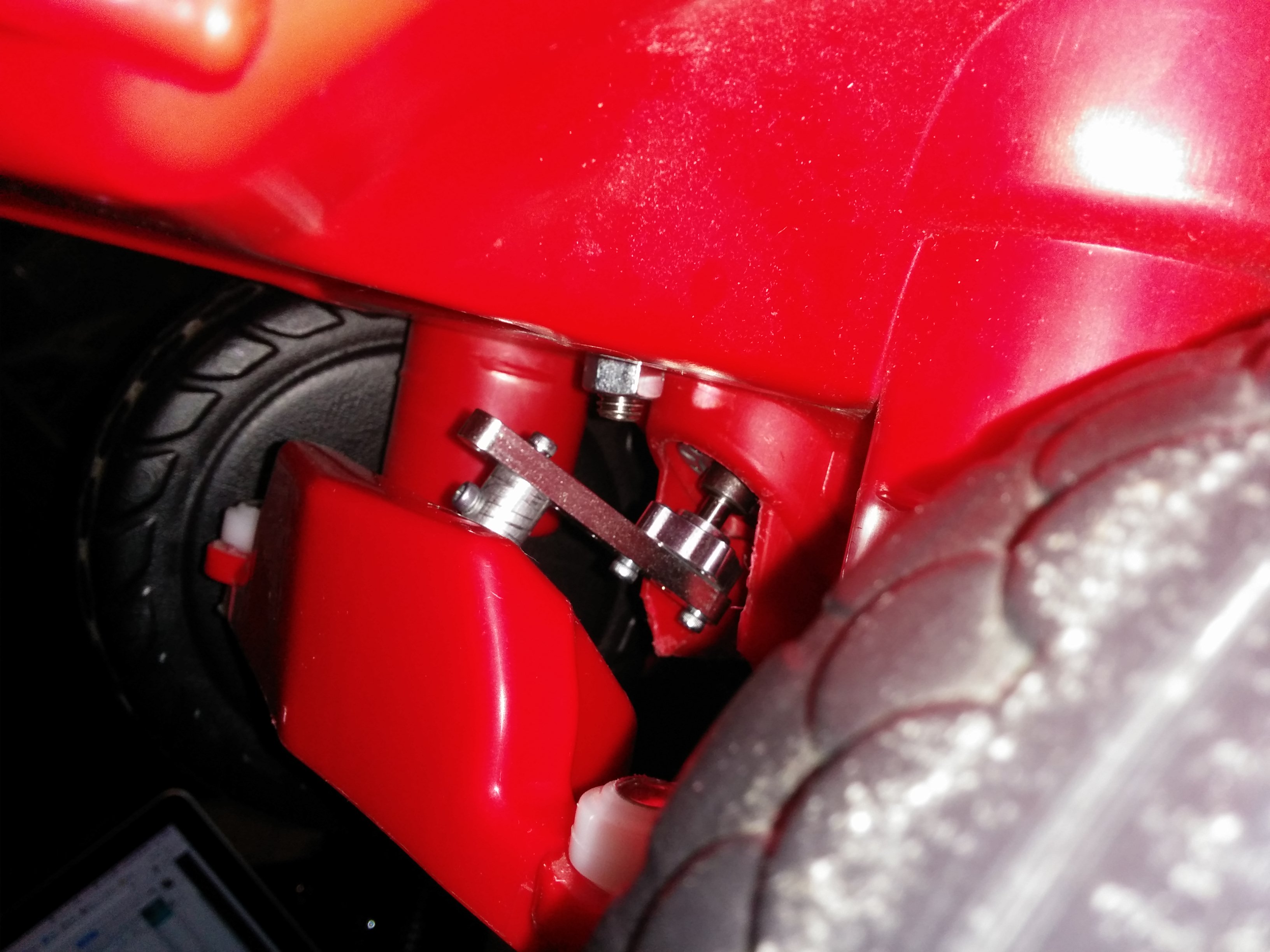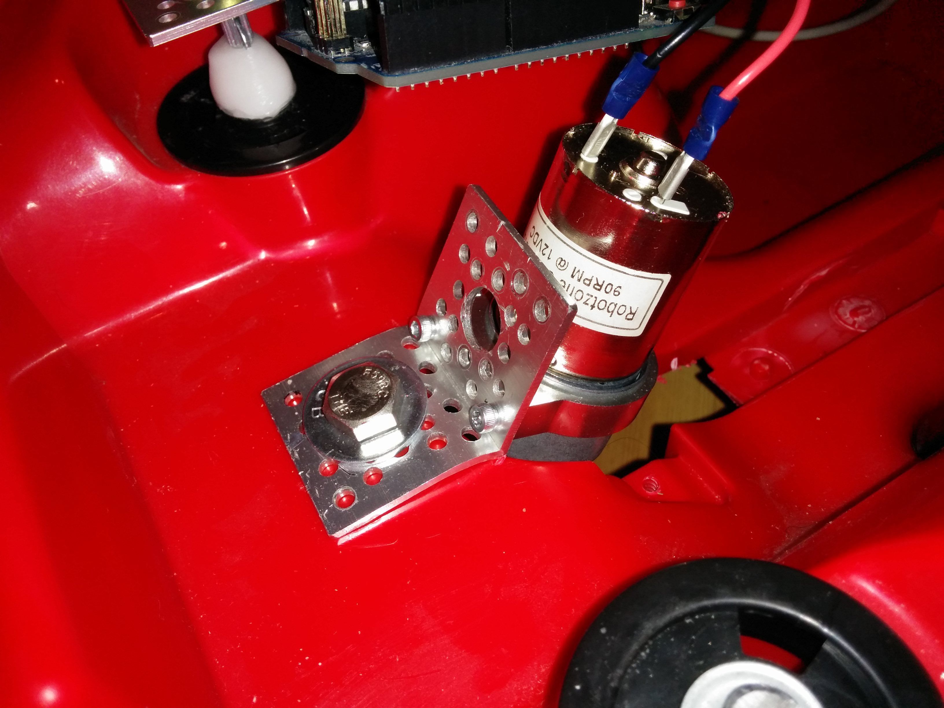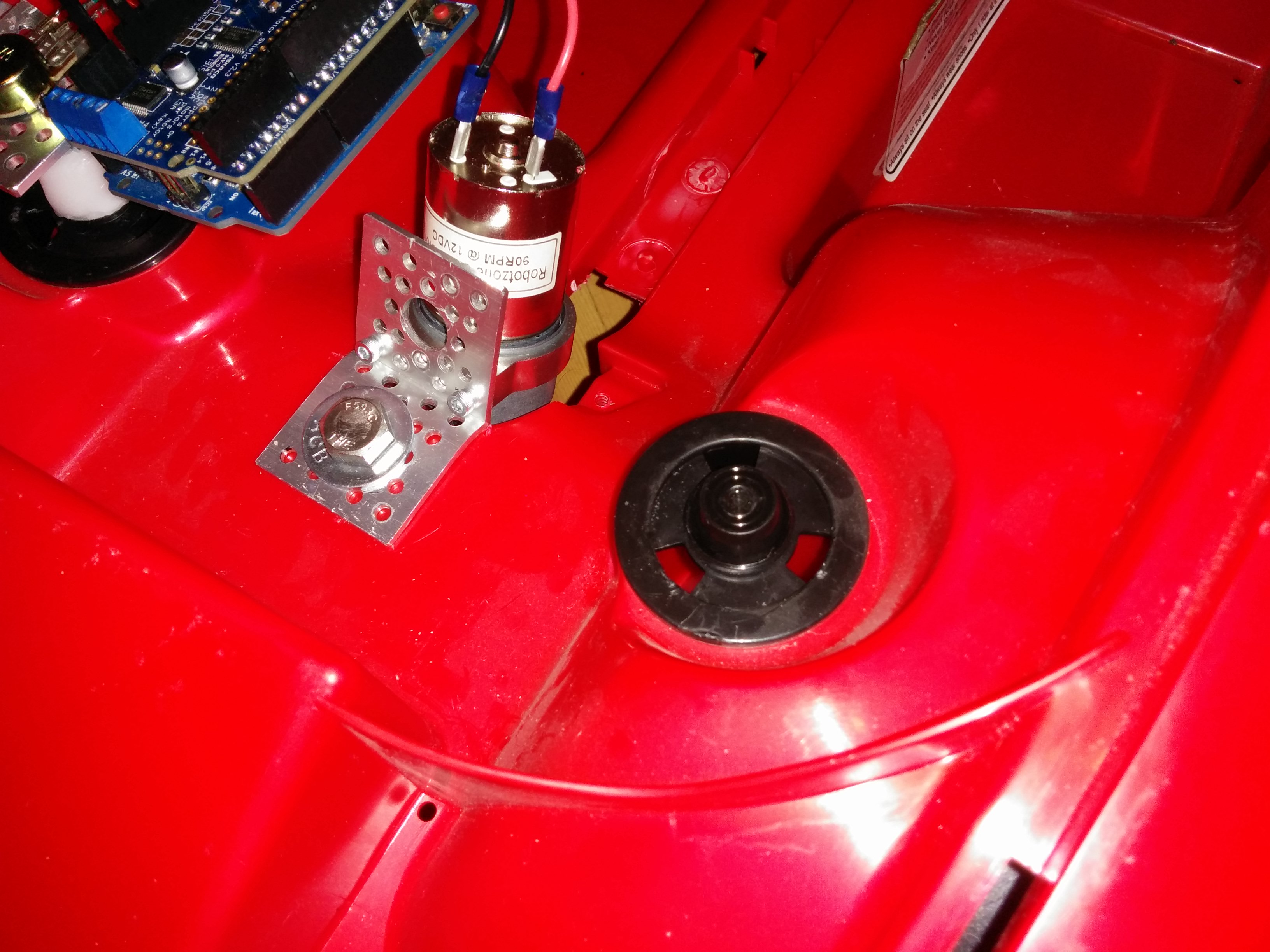 The steering wheel that comes with the car connects to a hollow plastic steering shaft, at the end of which is a finger offset from center that will trace an arc as the steering wheel is turned. I’ve replaced this with a motor and some metal parts which trace the same arc and engage with the rest of the stock steering mechanism without further modification.