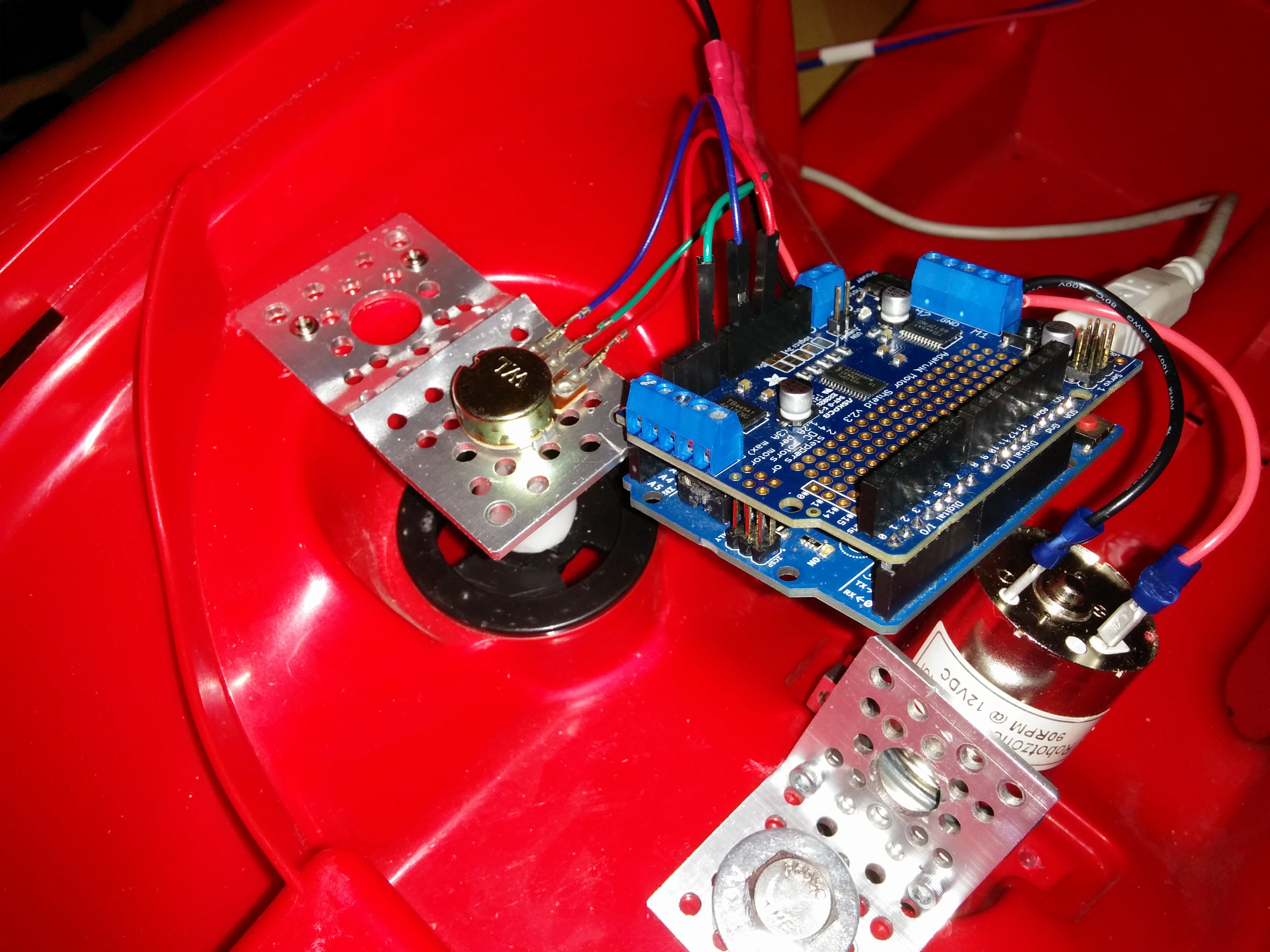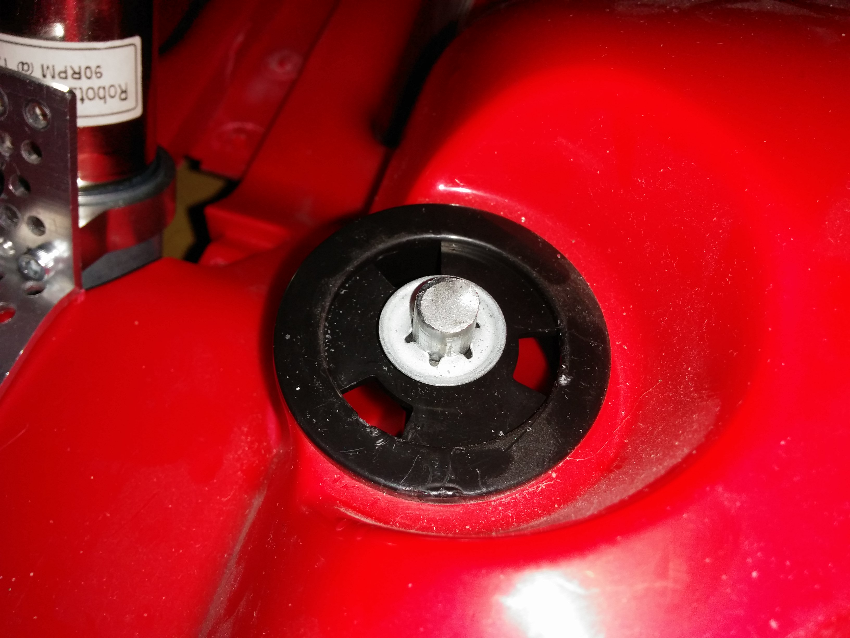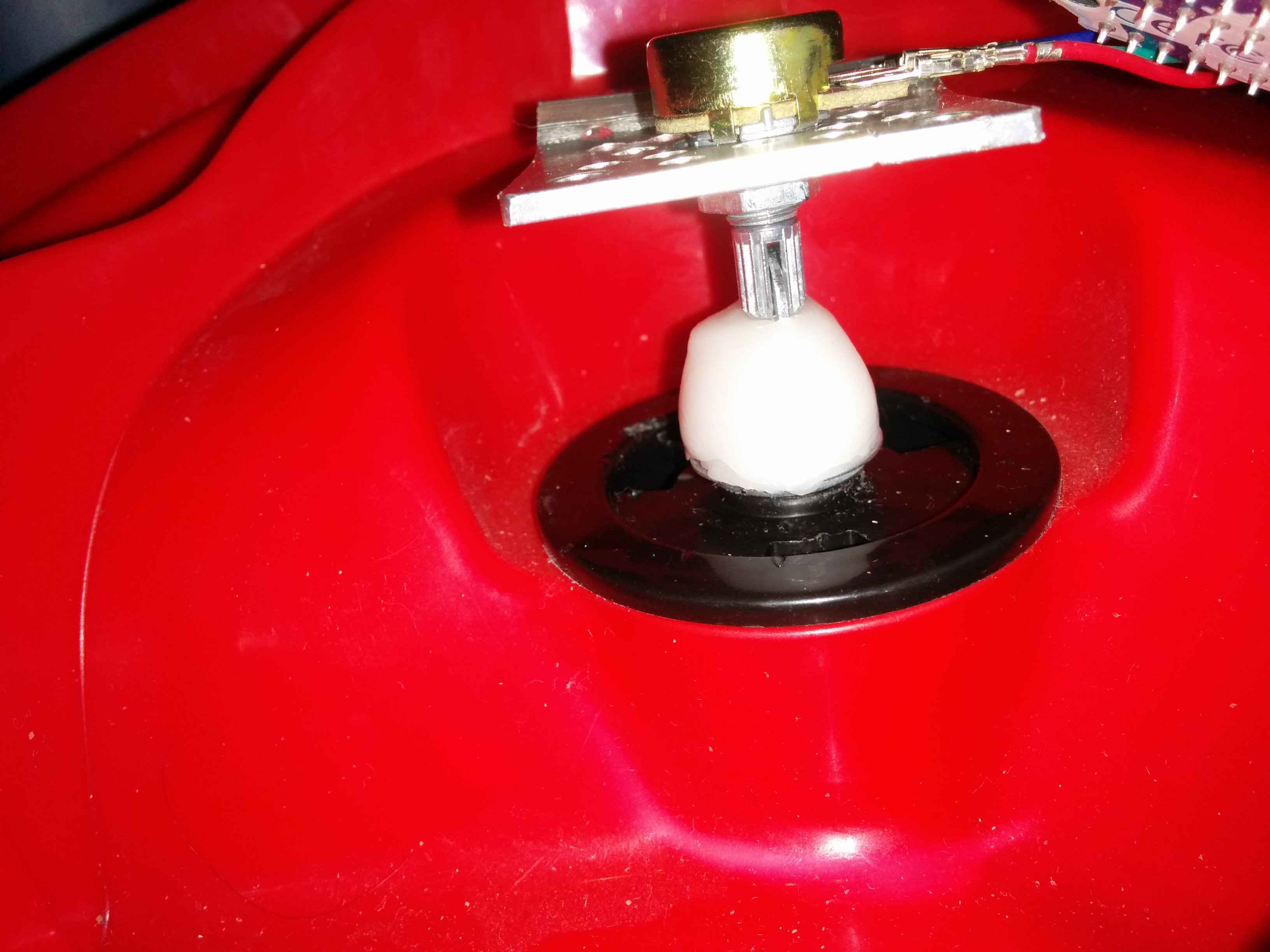 For the steering position, I’m using a simple pot. Here’s some pictures of prying off the plastic covers of the metal rods that hold the wheels. When the wheels turn the rods turn. So I used some moldable plastic to attach a washer to the rod. A slot in the knob of the pot engages with the washer in a way that has little rotational slop but still allows for imperfect centering and angle above the rod.