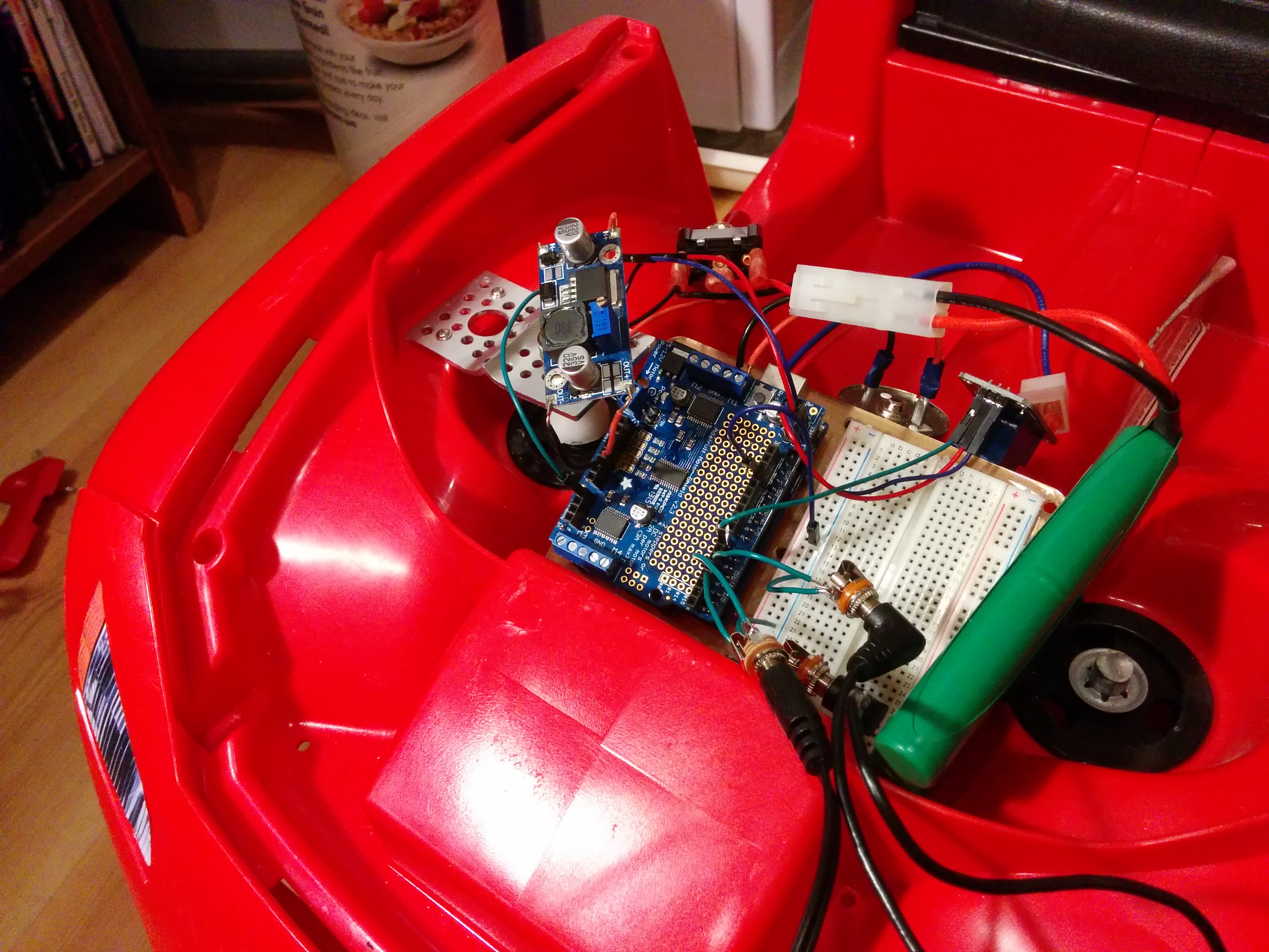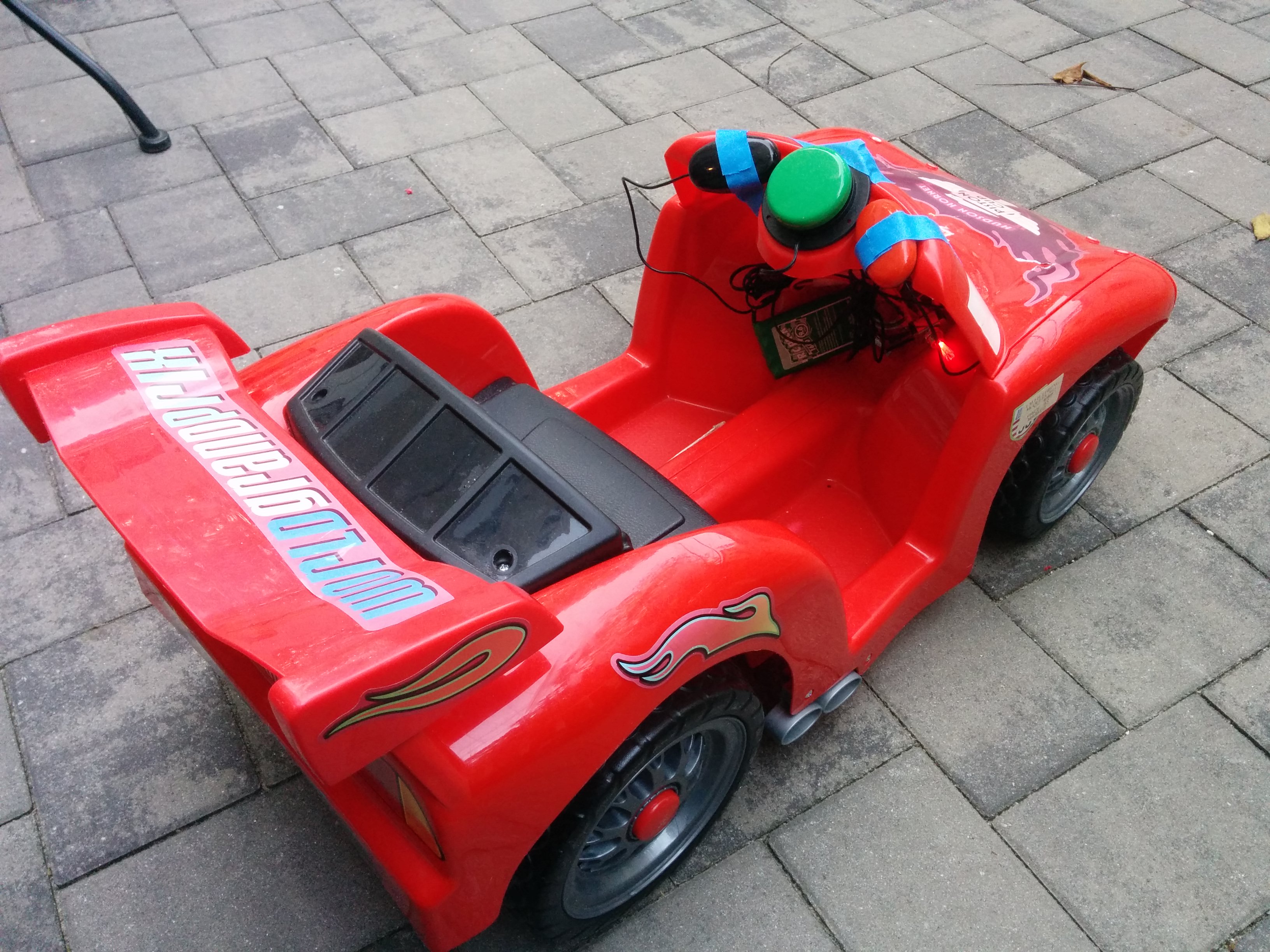 Since working on this, I found out about CooperCars, based off of modifying Hedstrom BOSS ride on toys, a nice starting point since they are already joystick controlled. Unfortunately the BOSS factory burnt down so few are still around.