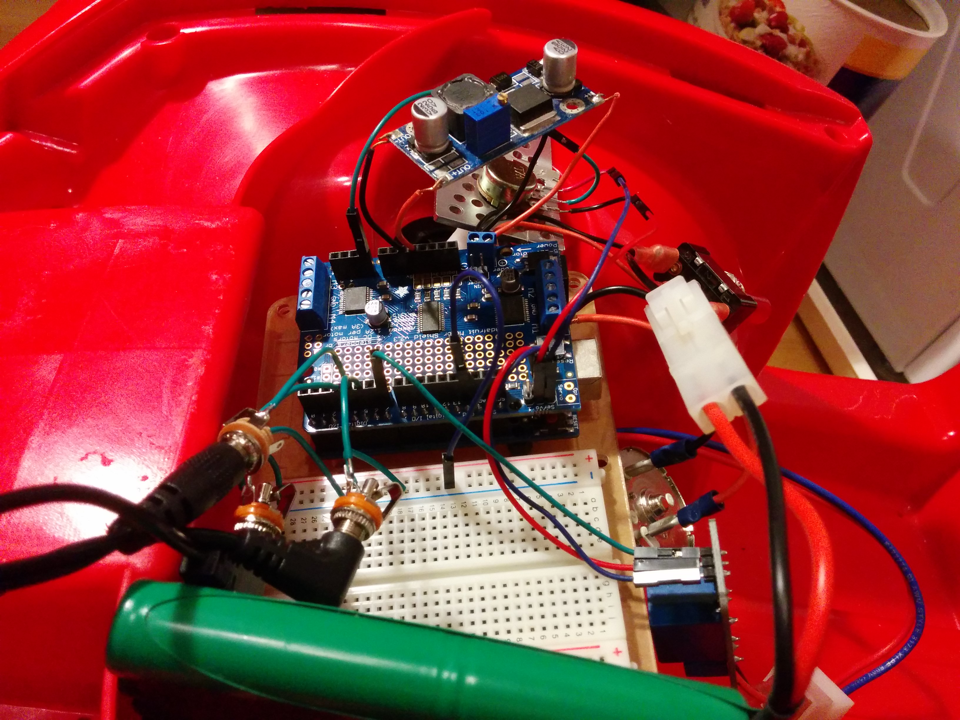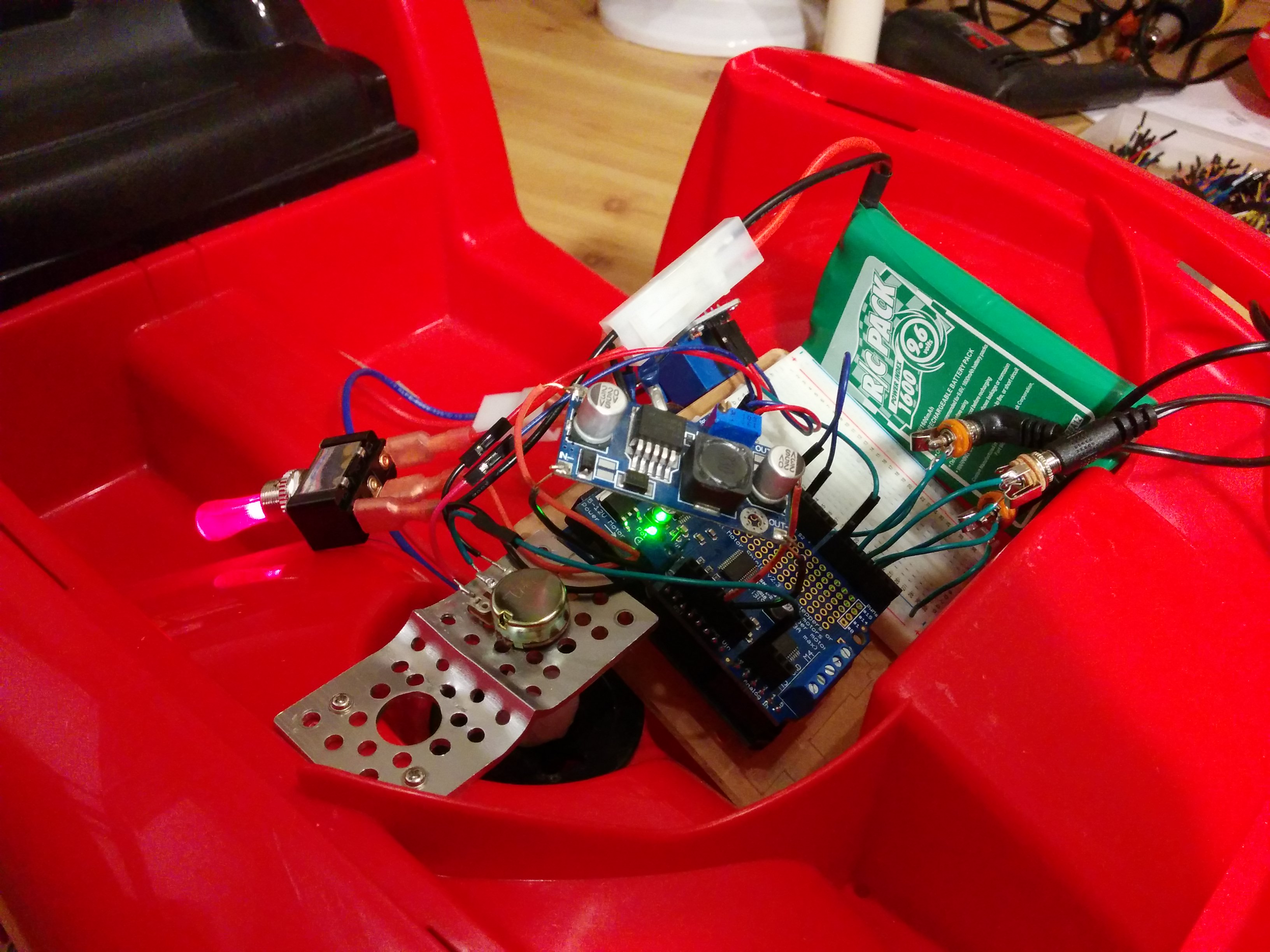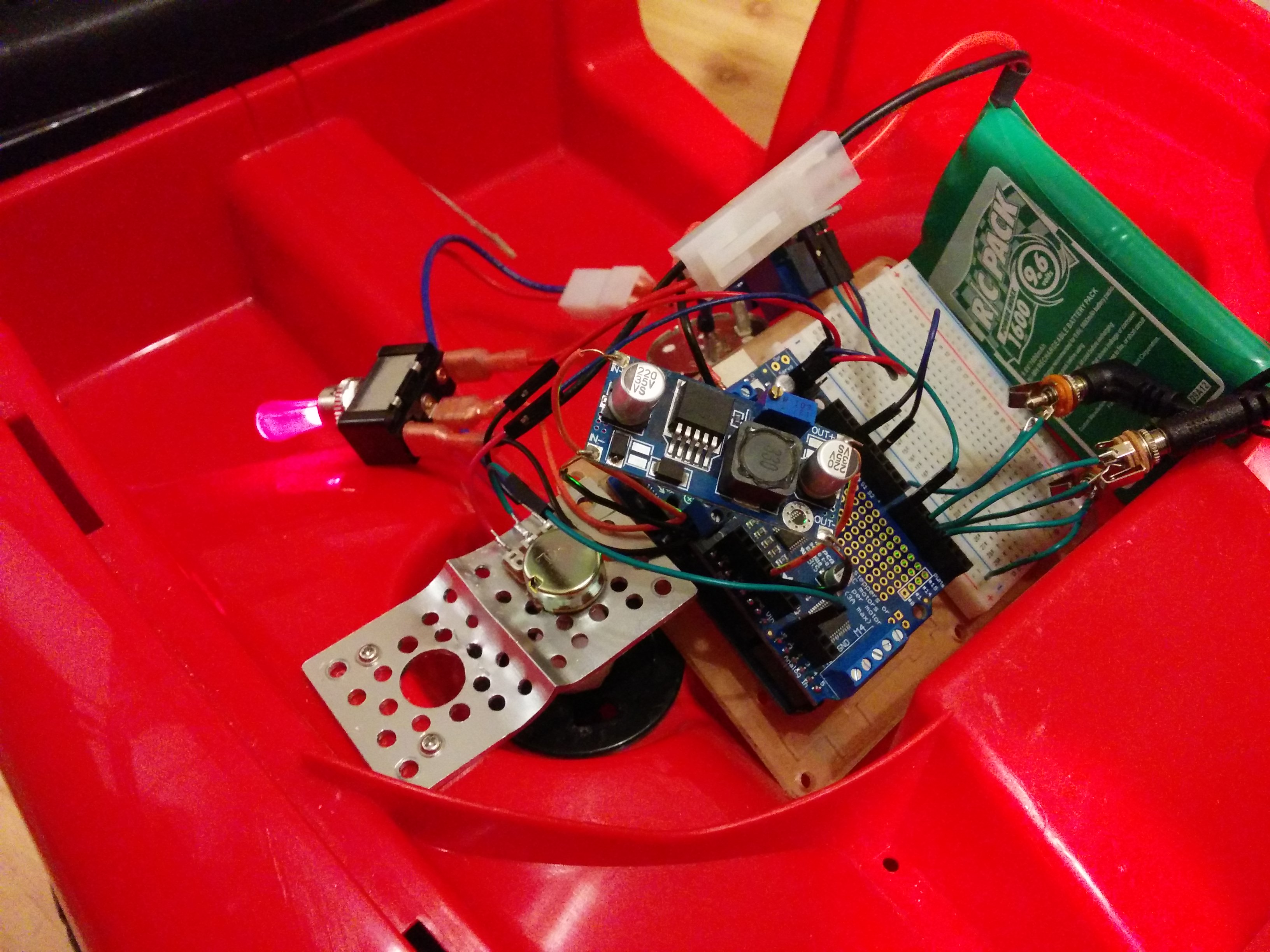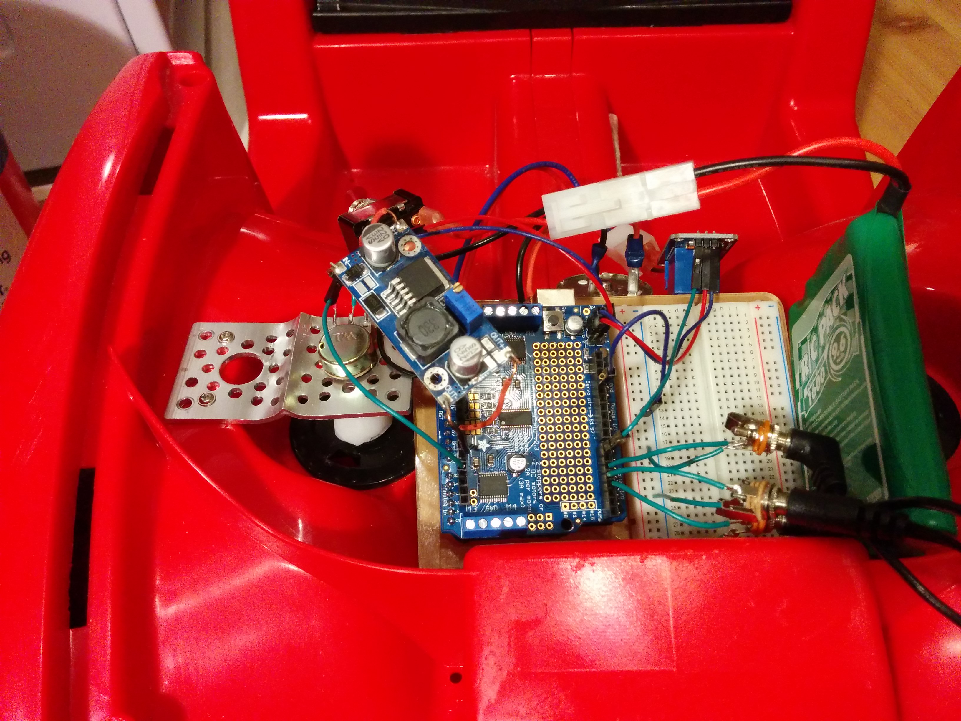 After discussion with the child’s physical therapist and the family, I changed the button controls to a joystick control. At the time of this rework I also thought it a good idea to make things a ‘little’ more permanent since I’d be giving them the car to keep, so I moved most of the electronics to the back under the seat where there was more room.