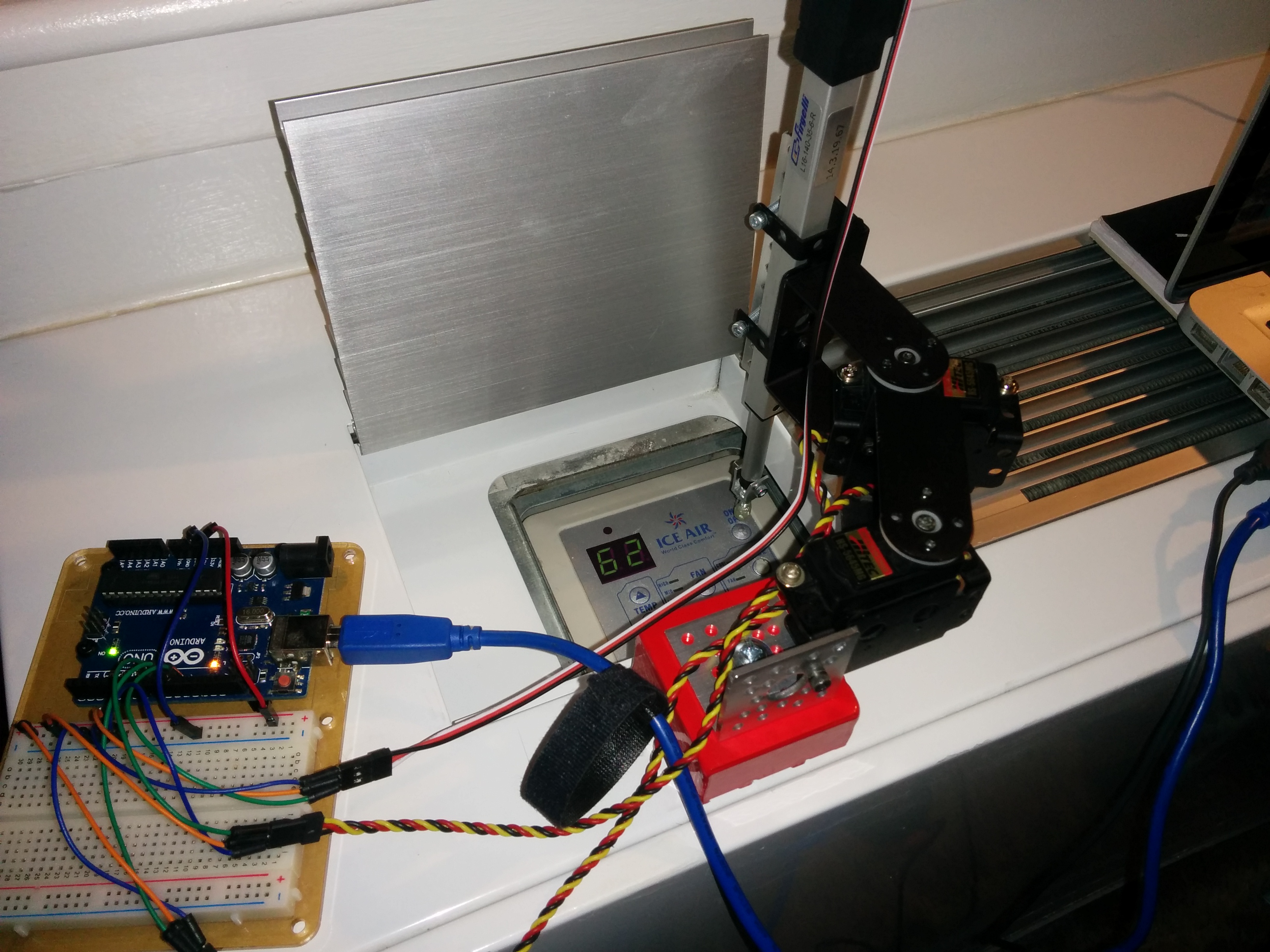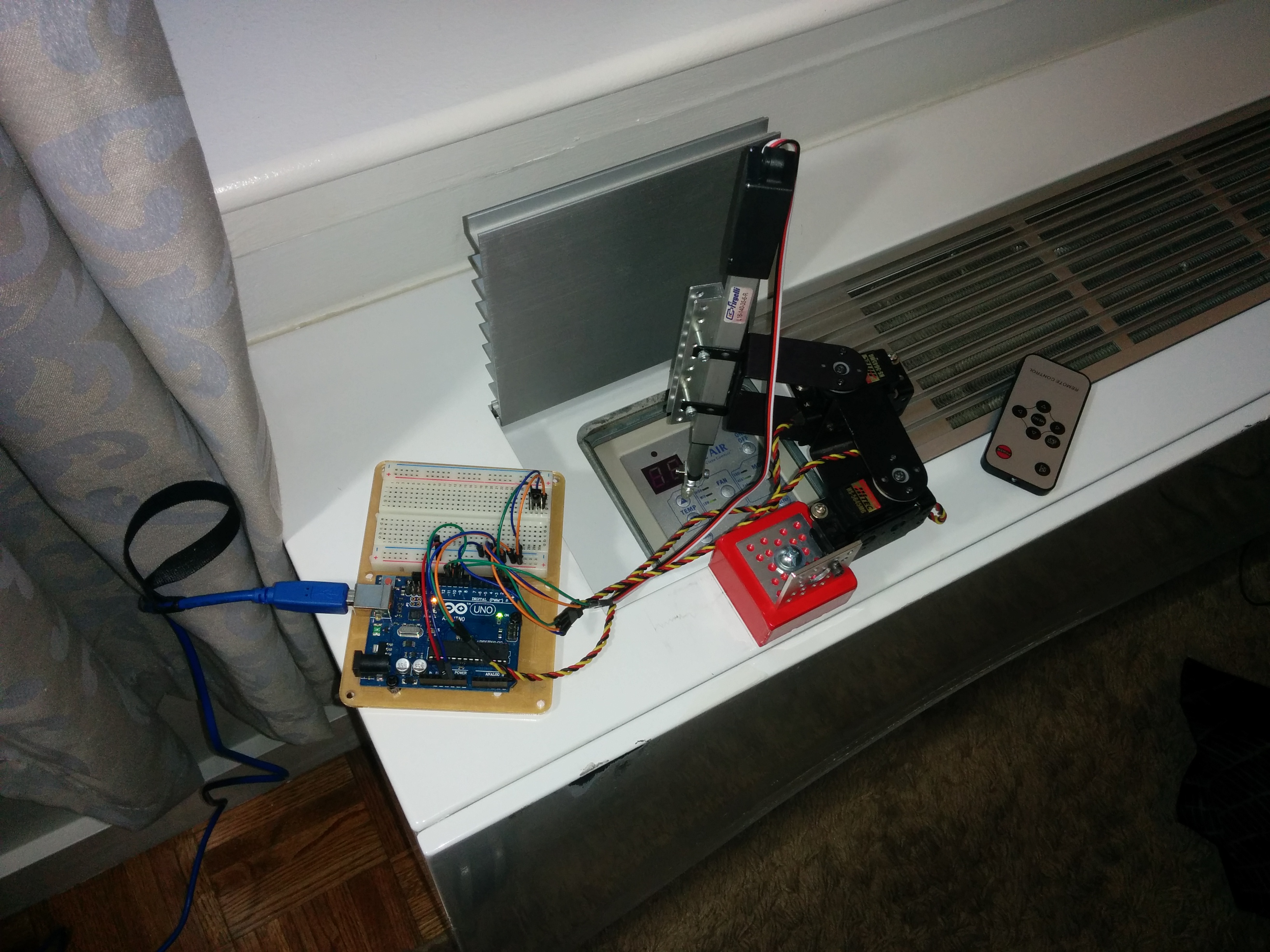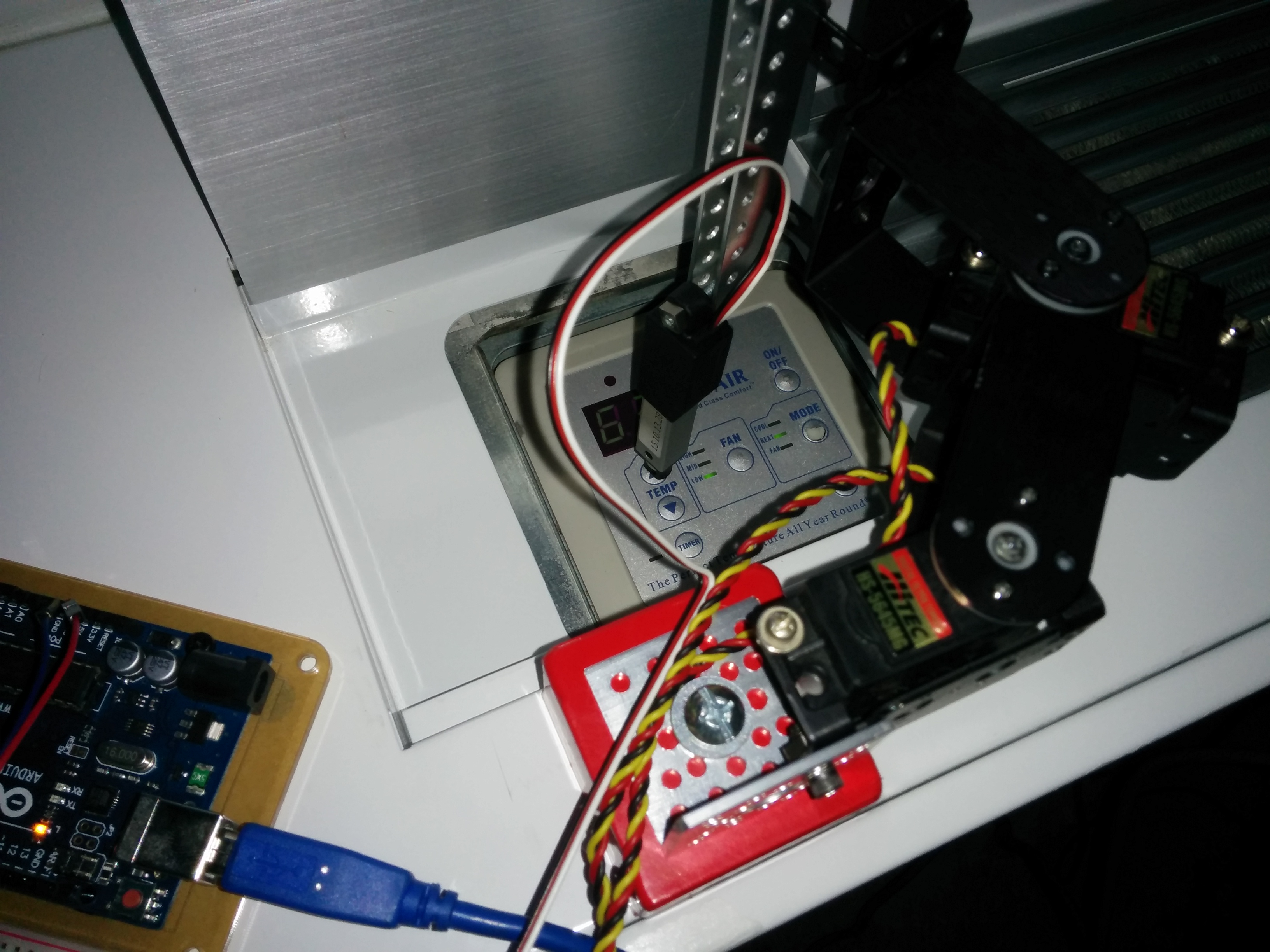 The person I was trying to help could see the control panel including the temperature display and other indicators, but was unable to hit the buttons. Due to ownership concerns, direct modifications to the PTAC electronics were not an option, nor was finding a way to move the control panel up out of the unit housing. To get around this I attempted to setup a button pusher (controlled by IR remote) that would control the PTAC.