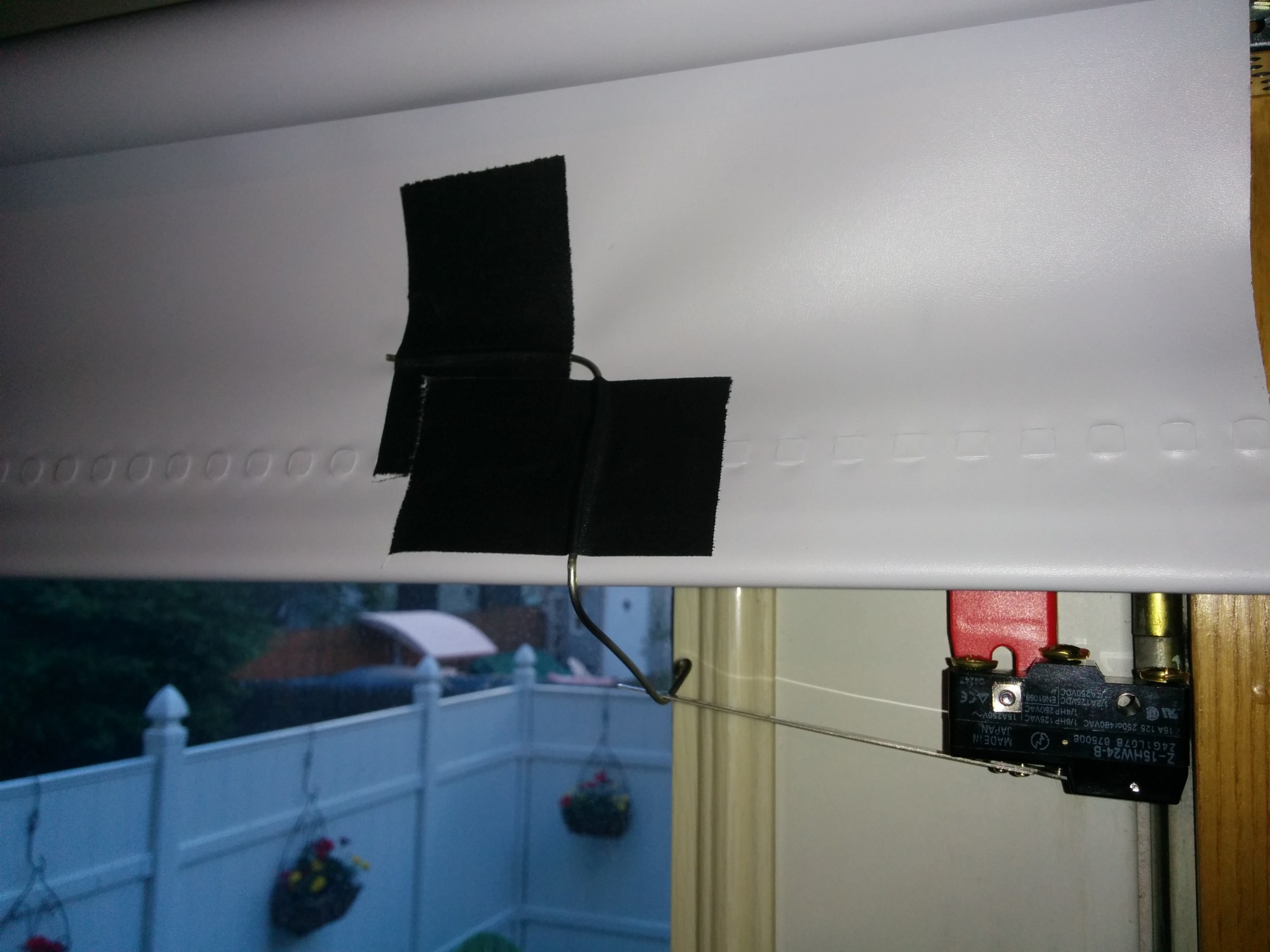 Here are some pictures of the micro switch setup at the user’s bedroom window. The plastic insert at the bottom of the shade is partially slid out of the right side to hit the limit switches.