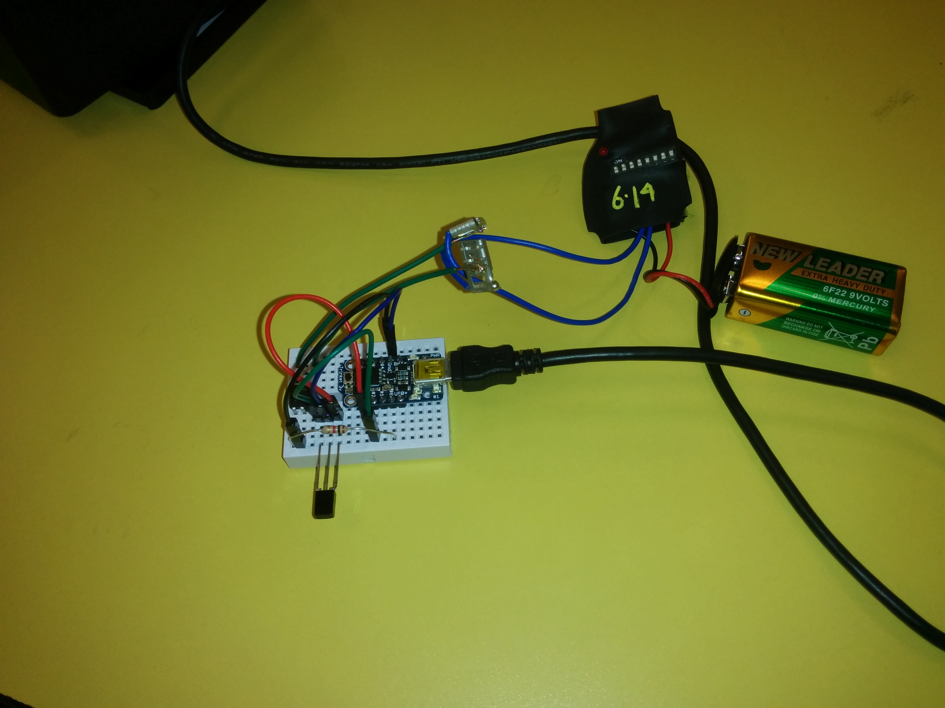 Here’s the original test circuit. It comprises of small microcontroller board (Adafruit Trinket 3V), IR receiver (TSOP38238), an SSR (VO14642AT), and the guts of the original RF remote for the door (transmitter and battery). The microcontroller listens on the IR receiver for the right command, at which point it pulses the SSR which closes the connection to trigger the RF transmitter. The Trinket board is powered off a USB cable connected to the AAC device.