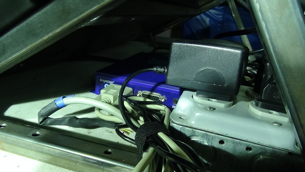 Each “material” is on a white plastic disk, the underside of which has an attached RFID tag. These are picked up by the RFID reader on the right of the exhibit. That MR-1824-MC reader from AWiD can be wired for RS-232 output, which works with the RS-232 port on the Bright Sign.